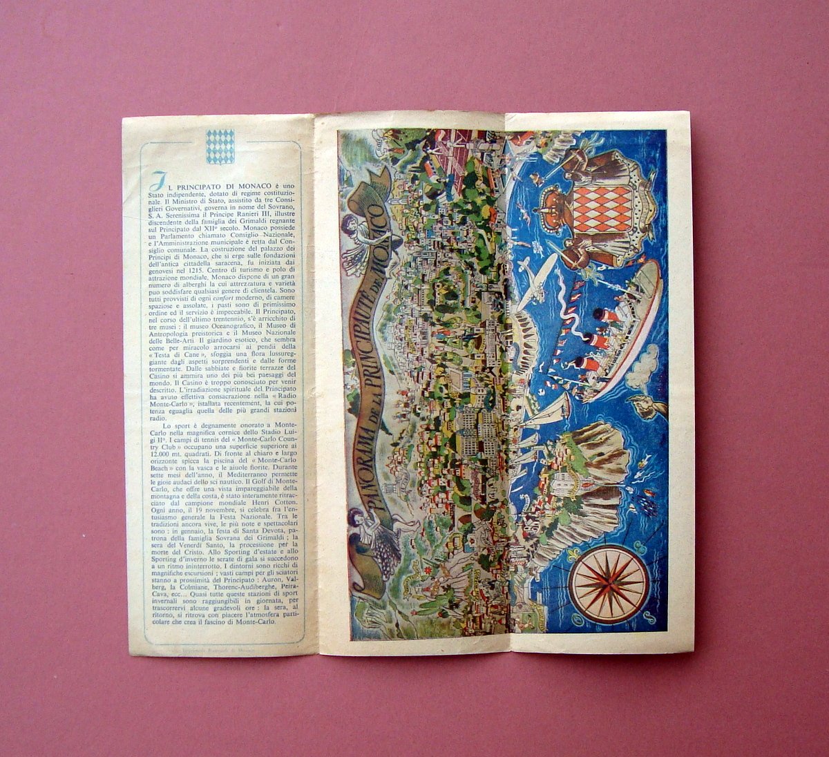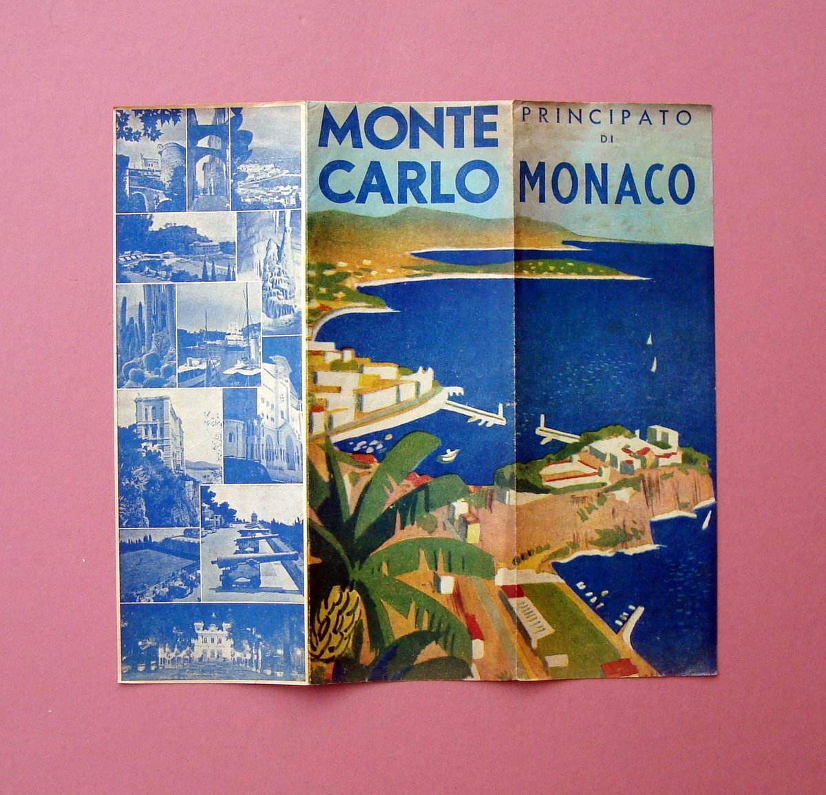 Imprimerie Nationale de Monaco; s.d. ma anteguerra, cm 23,5x8,5 (chiuso), cm 23,5x25 (aperto), pieghevole turistico ill. a colori (vedi foto)