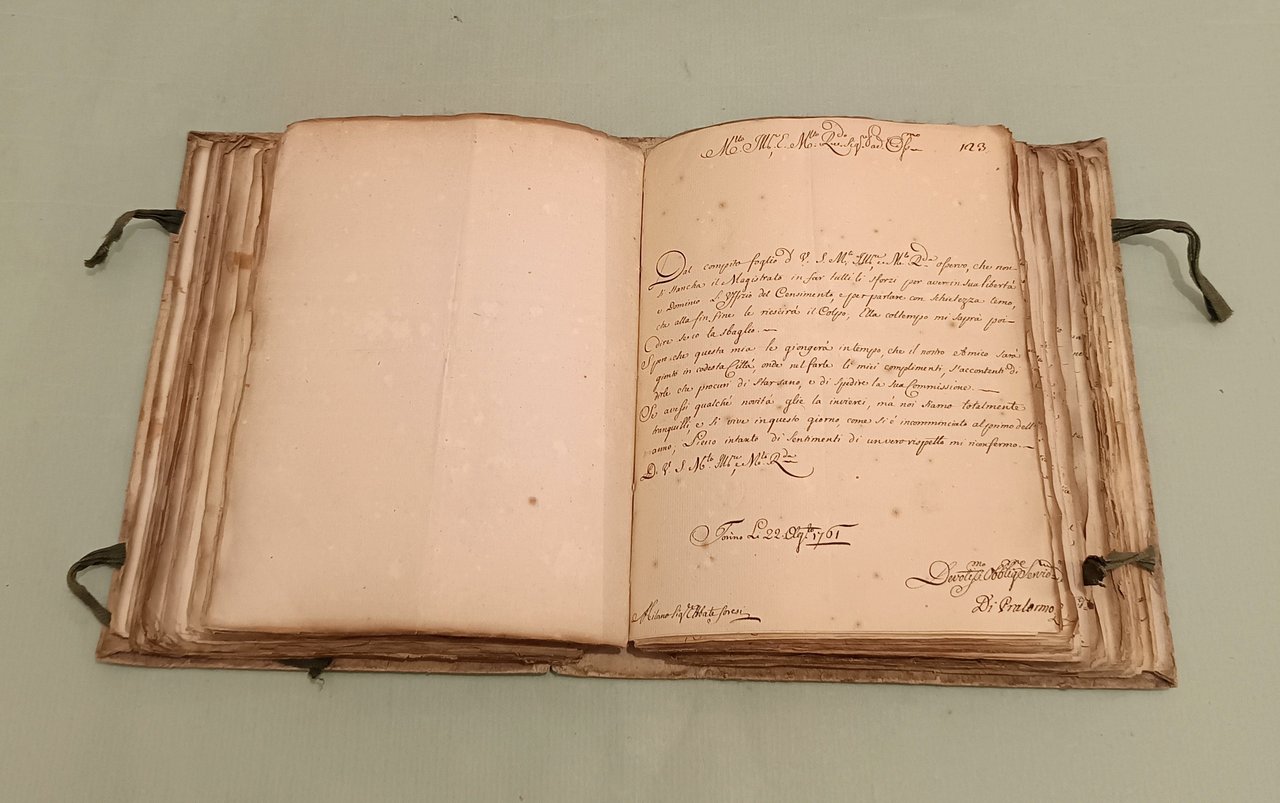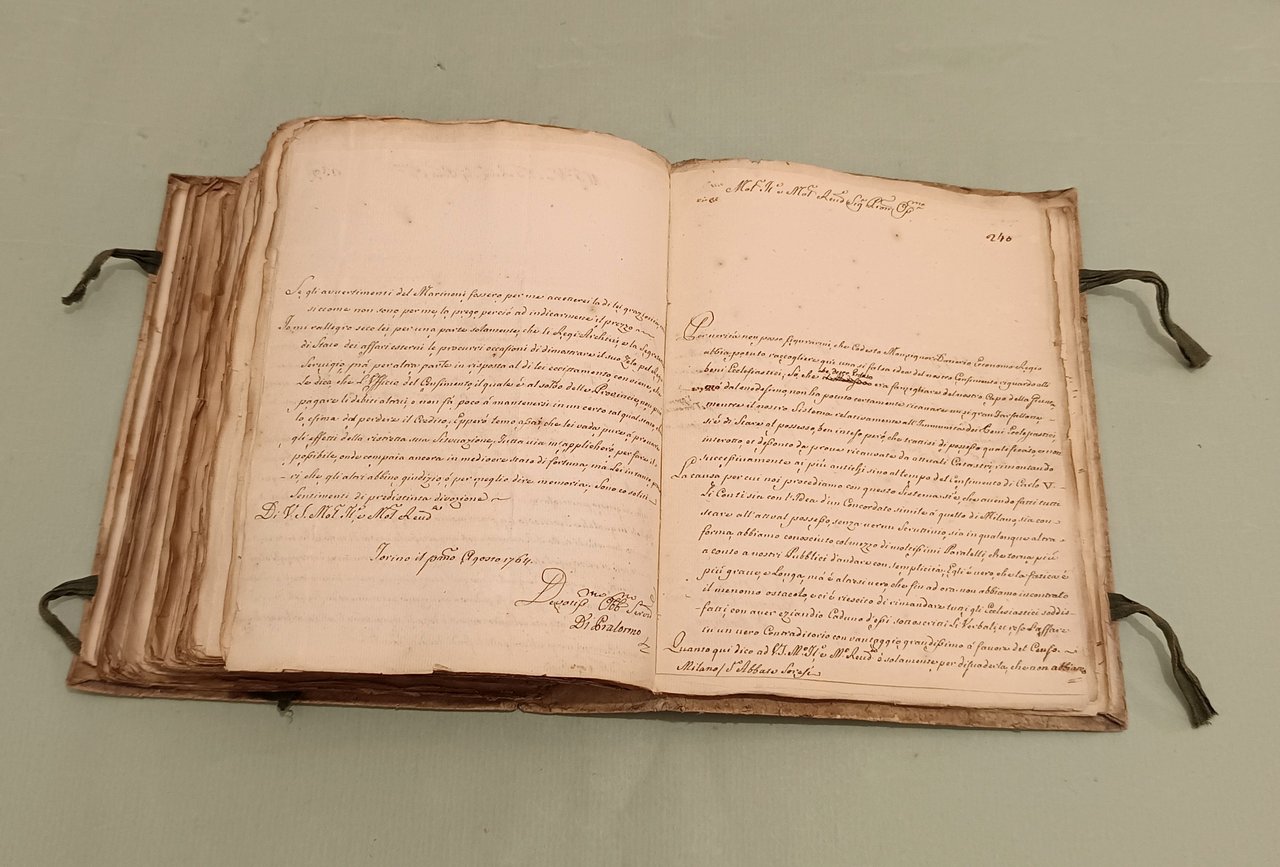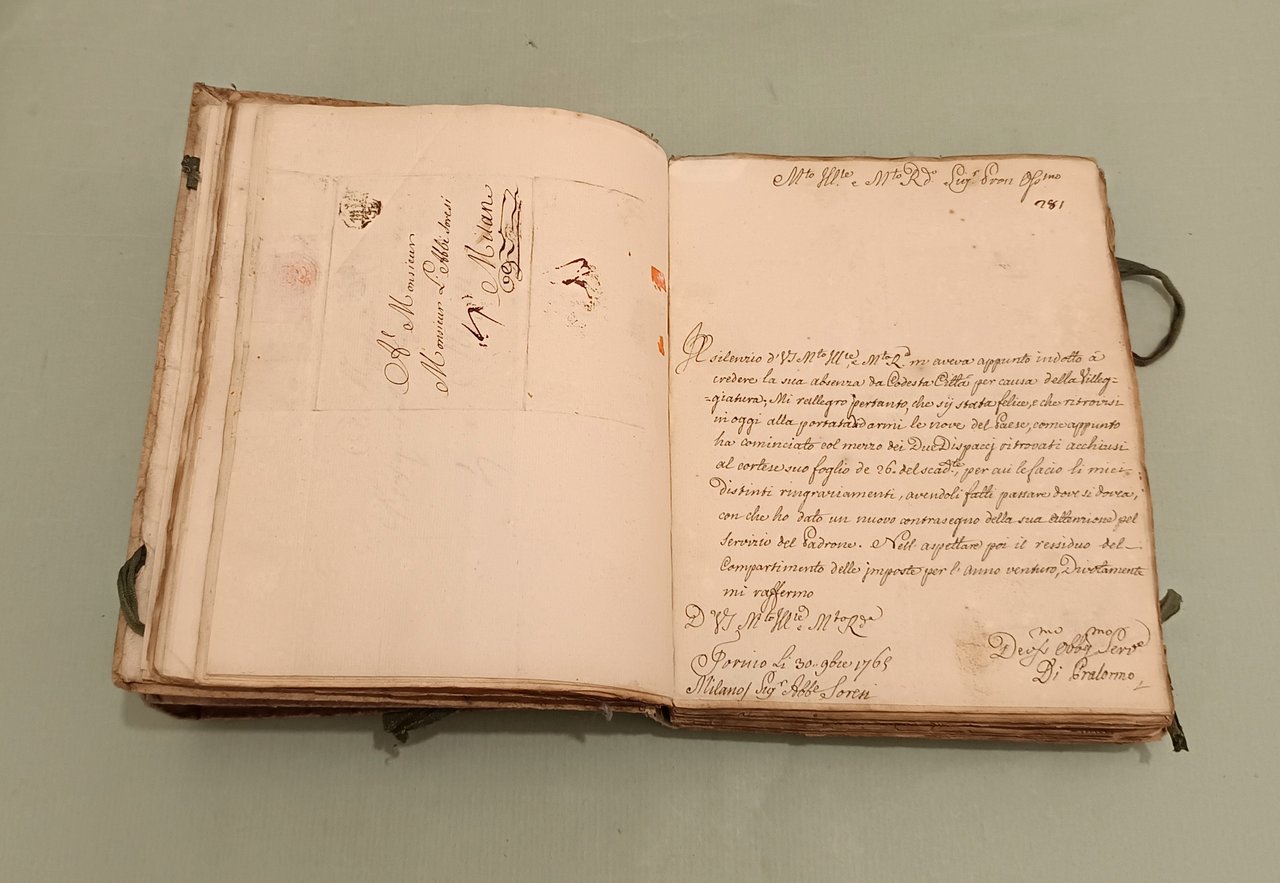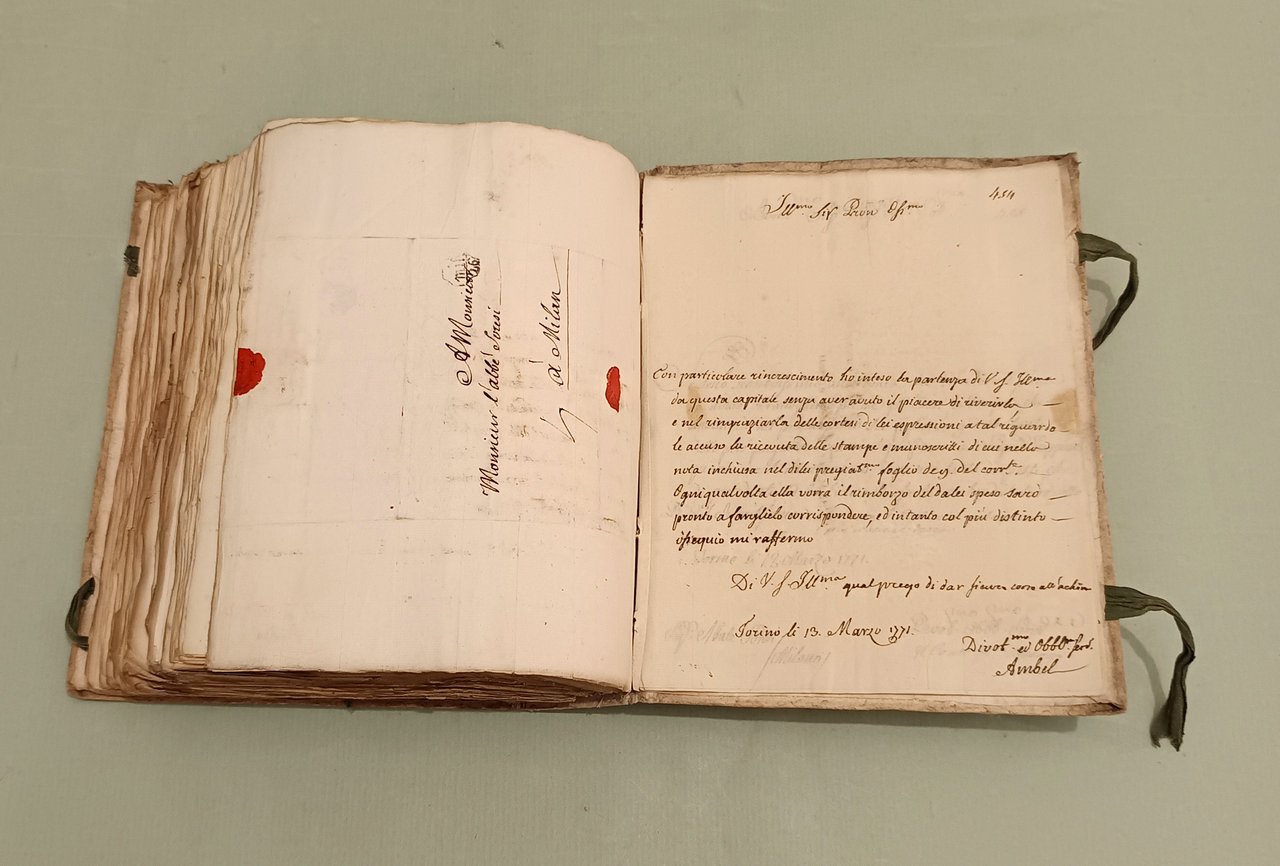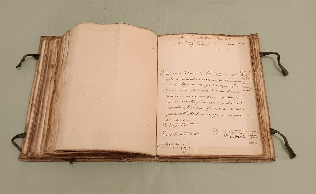 Raccolta di lettere di diversi Ministri e Capi di Dicasteri del Piemonte per Servizio e d’ordine di S.M. a Pier Domenico Soresi distribuite in due volumi. Parte prima che comincia li 14 ottobre 1758 e termina li 22 Xbre 1764. Parte seconda che comincia li 16 Genn. 1765 e termina li 30 Dicembre 1771. Due volumi in 8vo (cm.26x21) Cart. coevo, legacci. Oltre 450 lettere manoscritte legate insieme, alcune con timbri di ceralacca. In principio di ciascun volume “indice degli autori delle lettere”. Magnifici squarci della vita amministrativa, culturale e politica in Piemonte. I rapporti tra i funzionari e la Corte, tra funzionari e funzionari. Il forbito eloquio fanno di questa raccolta uno specchio inimitabile del bel settecento italiano.