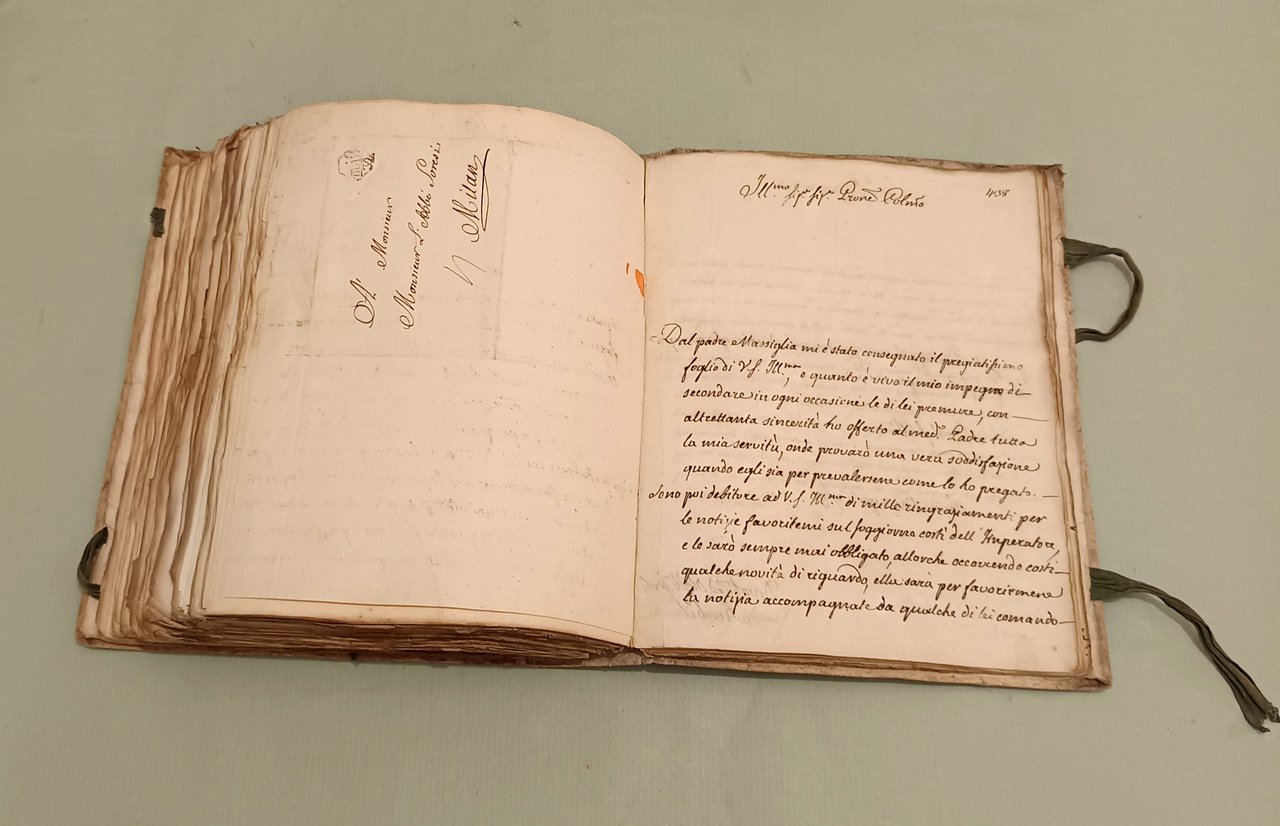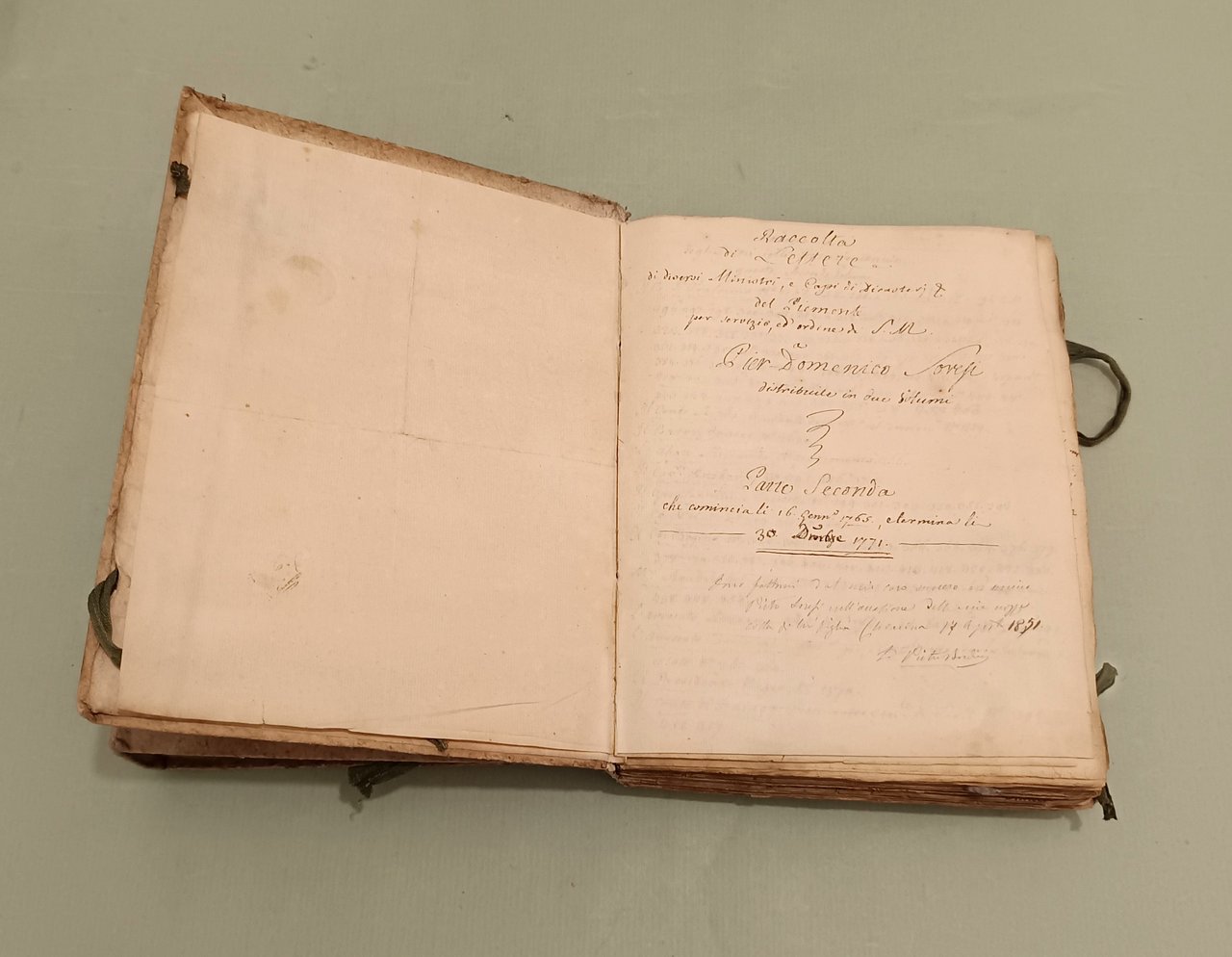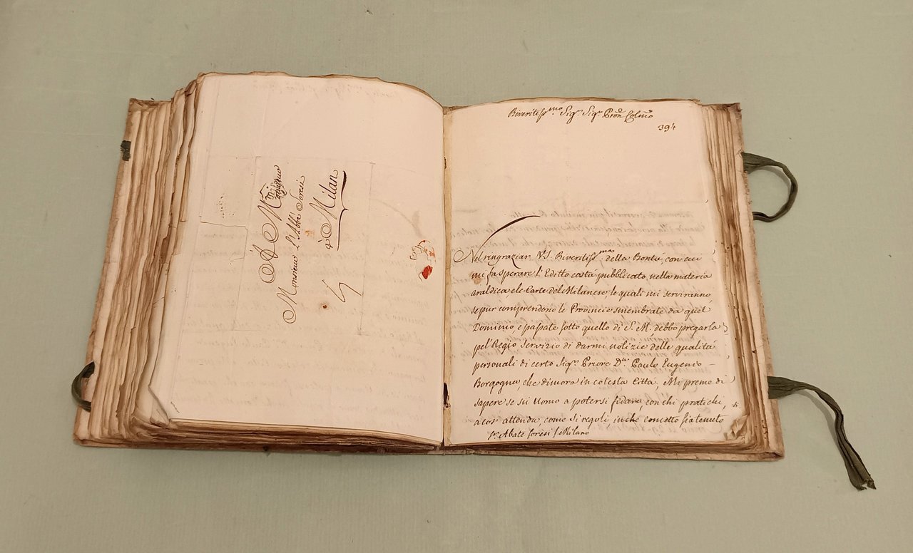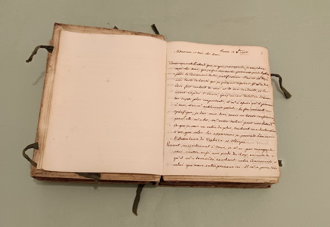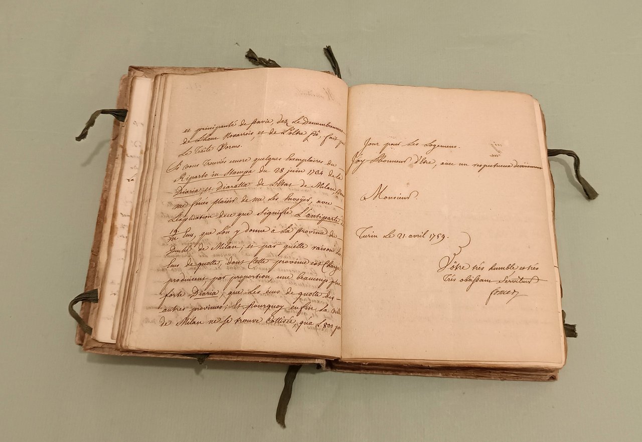Raccolta di lettere di diversi Ministri e Capi di Dicasteri del Piemonte per Servizio e d’ordine di S.M. a Pier Domenico Soresi distribuite in due volumi. Parte prima che comincia li 14 ottobre 1758 e termina li 22 Xbre 1764. Parte seconda che comincia li 16 Genn. 1765 e termina li 30 Dicembre 1771. Due volumi in 8vo (cm.26x21) Cart. coevo, legacci. Oltre 450 lettere manoscritte legate insieme, alcune con timbri di ceralacca. In principio di ciascun volume “indice degli autori delle lettere”. Magnifici squarci della vita amministrativa, culturale e politica in Piemonte. I rapporti tra i funzionari e la Corte, tra funzionari e funzionari. Il forbito eloquio fanno di questa raccolta uno specchio inimitabile del bel settecento italiano.
