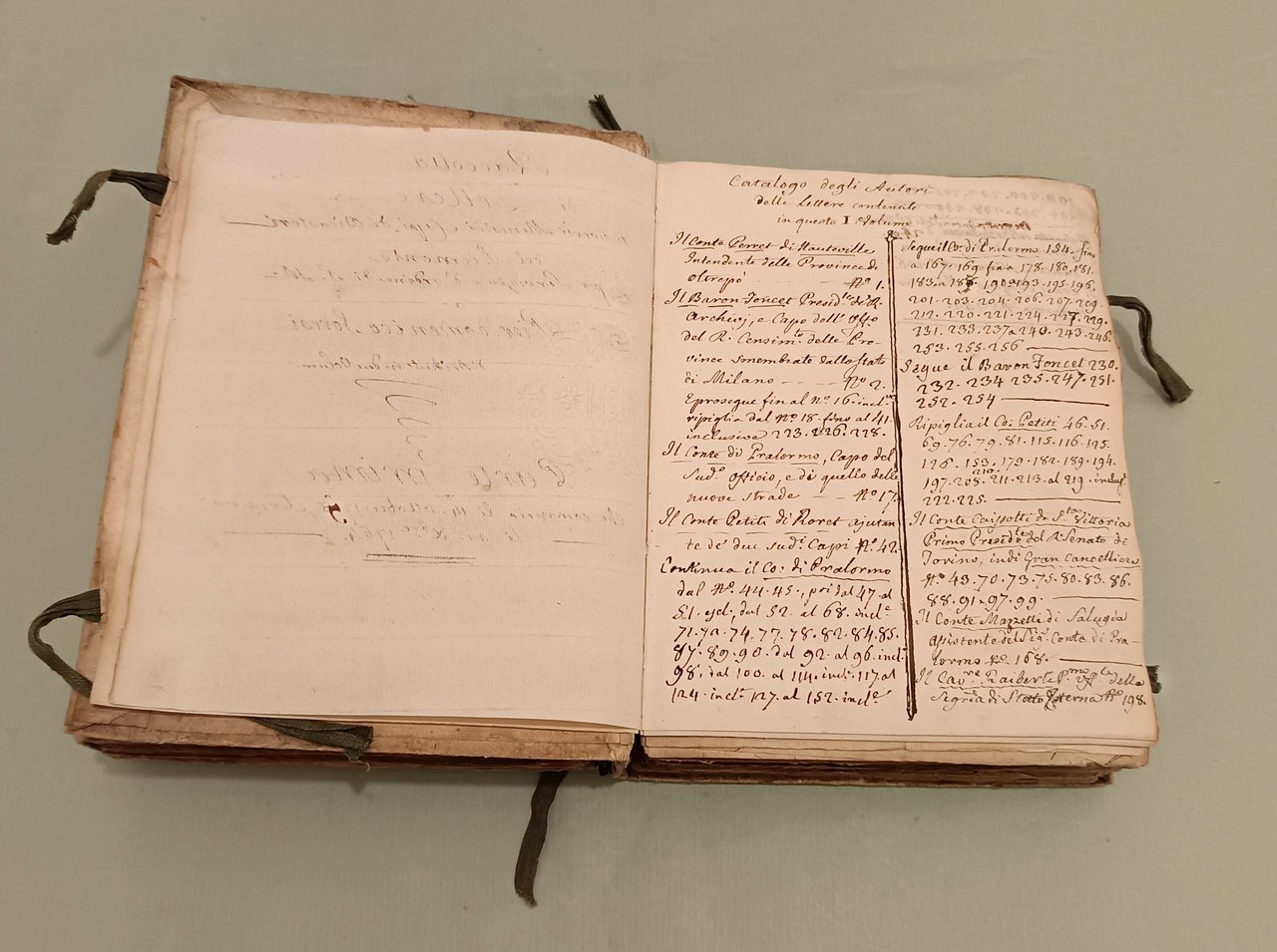 Raccolta di lettere di diversi Ministri e Capi di Dicasteri del Piemonte per Servizio e d’ordine di S.M. a Pier Domenico Soresi distribuite in due volumi.