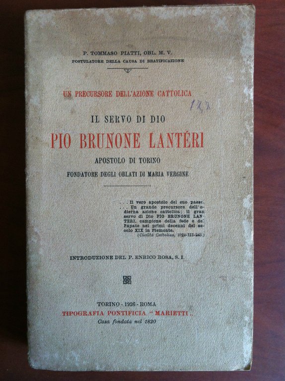 Pio Brunone Lantéri il servo di Dio fondatgore oblati Maria Vergine 1926- E19561 | Libri antichi e moderni | ,