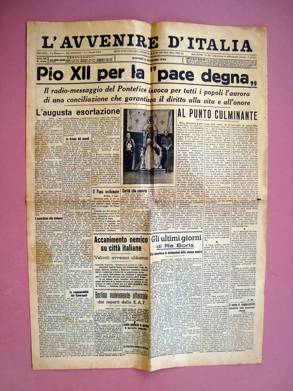 PIO XII Pace Degna L'Avvenire d'Italia Anno XLVIII N 202 2 sett 1943 completo | Libri antichi e moderni |