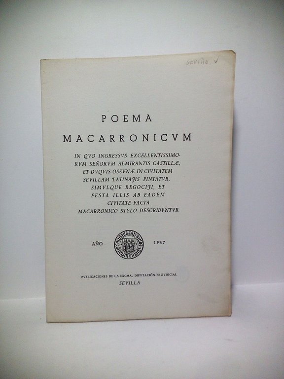 Sevilla: Publs. de la Excma. Diputación Provincial (Imp. Provincial), 1947.- 17 p., [1 h.]; 4º (22,2 x 16,1 cm); Excelente impresión sobre magnífico papel de hilo con marca al agua de la casa Vilaseca; Conjunto de pliegos sin coser.- Al final en el colofón indica: Este Poema Macarronicum, copia fiel del rarísimo impreso anónimo, y, al parecer, ejemplar único, que se conserva en el Archivo Municipal de Sevilla (Papeles del Conde del Aguila, tomo 23-I.º), se acabo de estampar en dicha ciudad el día 20 de Febrero del Año del Señor MCMXLVII.- Aunque no va indicado, es una edición de muy corta tirada.* Al comienzo del poema tiene estampado el sello tampón de una antigua biblioteca. ANDALUCÍA