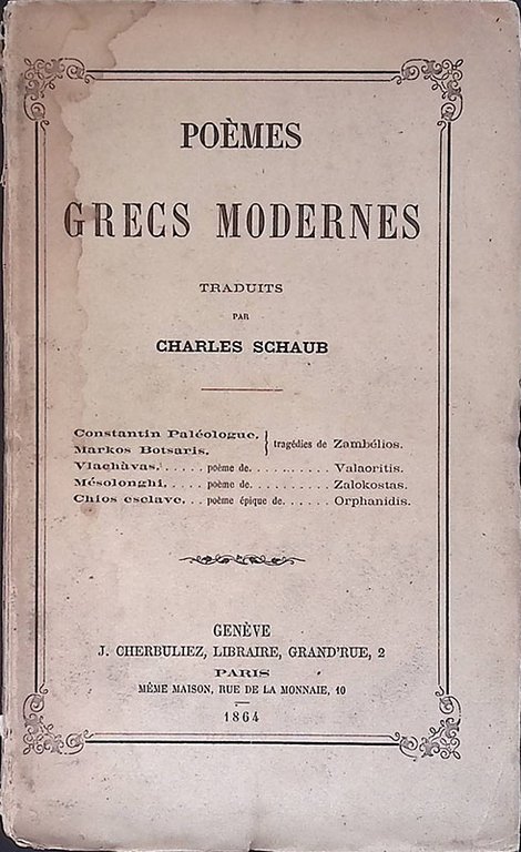 Testo in francese, traduzione di Charles Schaub. Lista dei poemi: tragédies de Zambélios, poème de Valaoritis, Poème de Zalokostas, Poème épique de Orphanidis. 348 p., f.to cm 19x11,5, copertina flessibile. Buone condizioni.