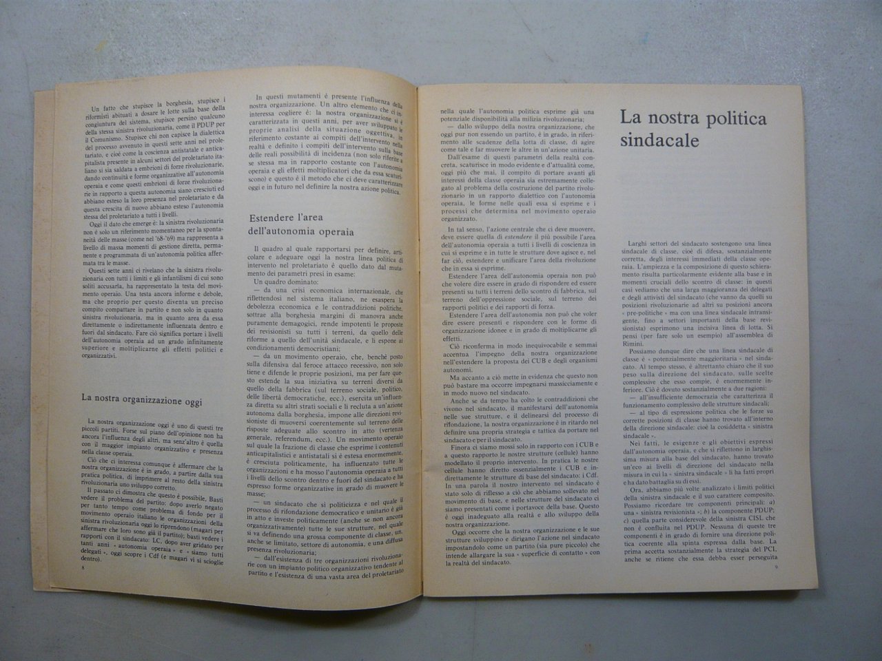 A cura di collaboratori fissi Russi, Boffo, Pugliese e GiannolaPOLITICA COMUNISTA N°3/marzo ’75Rivista mensile dell’Organizzazione Comunista Avanguardia OperaiaComitato di redazione: Baldi, Barbero, Brioschi, Campi, Cereda, Fumagalli, Mangano, Notturna, Randazzo, Ronchi e ReiserNuova Cultura, Milano, marzo 1975Rivista, 27x21 cm, pp. 48Peso: g. 119Cod:4853CONDIZIONI DELLA RIVISTA:Buone condizioni nel complesso. Pagine ingiallite, copertina e retro presentano macchie di scurimento.