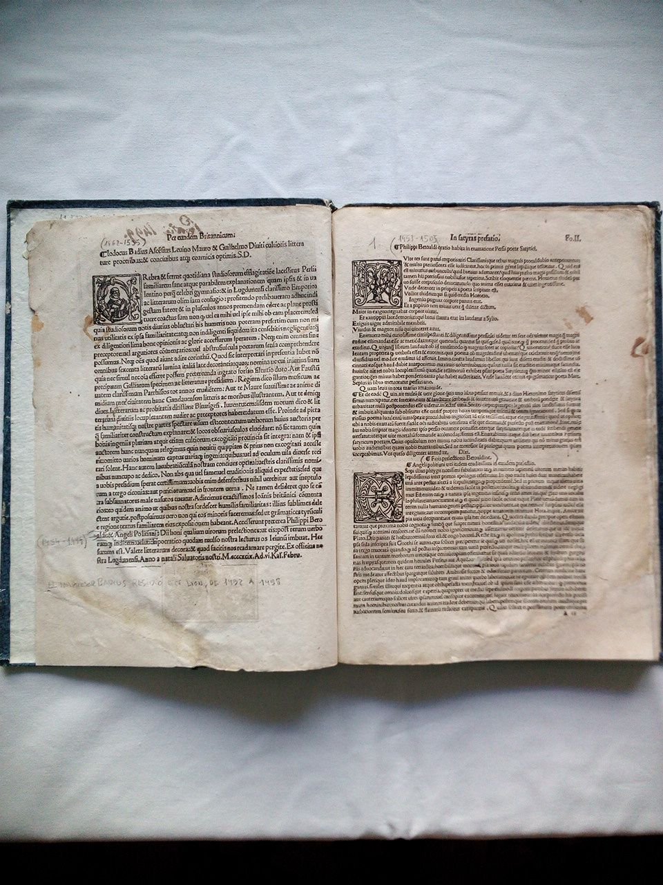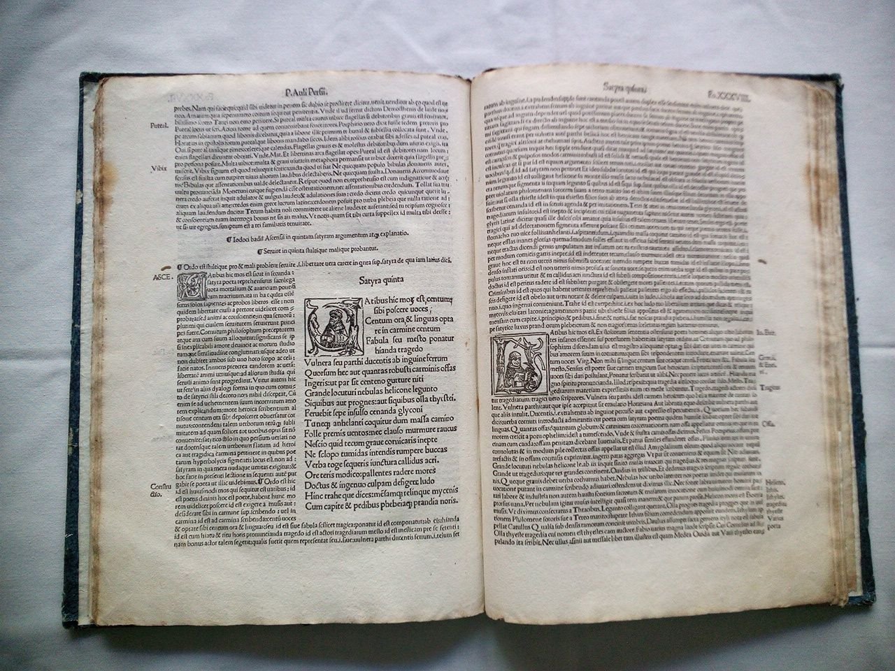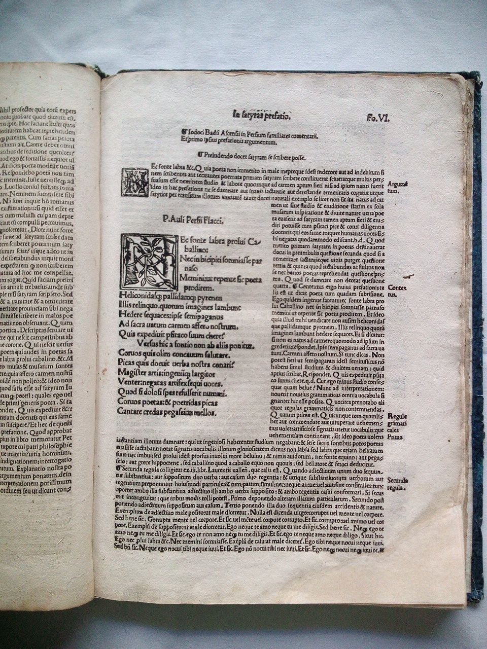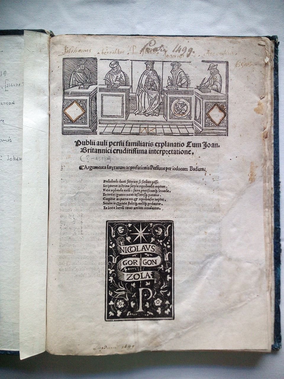 [Portada. Folio I. sig. A i (ambos sin numerar). Comienza en cabeza con un grabado en madera representando a Persio en el centro, flanqueado por cuatro escribanos en sus pupitres]. [Debajo del grabado sigue texto] Publii auli persii familiaris explanatio Cum Joan. Britannici eruditissima interpretatione. Argumenta satyrarum ac prefationis Persiane per iodocum Badium. [Sigue debajo un verso en 7 líneas y letra cursiva] Preludendo docet satyram se scribere posse / Scriptorem in Prima satyra reprehendit meptum. / Vota nephanda auidi : sacra pontificum(que) Secunda. / In tertia ignauos notat inflatos(que) potentes. / Carpitur in quarta rex et reprebensor ineptus. / Servire in Quinta stulti(que) mali(que) probantur. / In Sexta heredi taxat | Libri antichi e moderni | Persii, Auli [Aulus Persius Flaccus, Aulio Persio Flaco. 34 D. C. - 62 D. C.]
