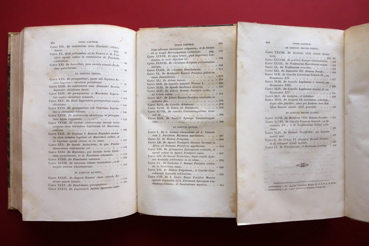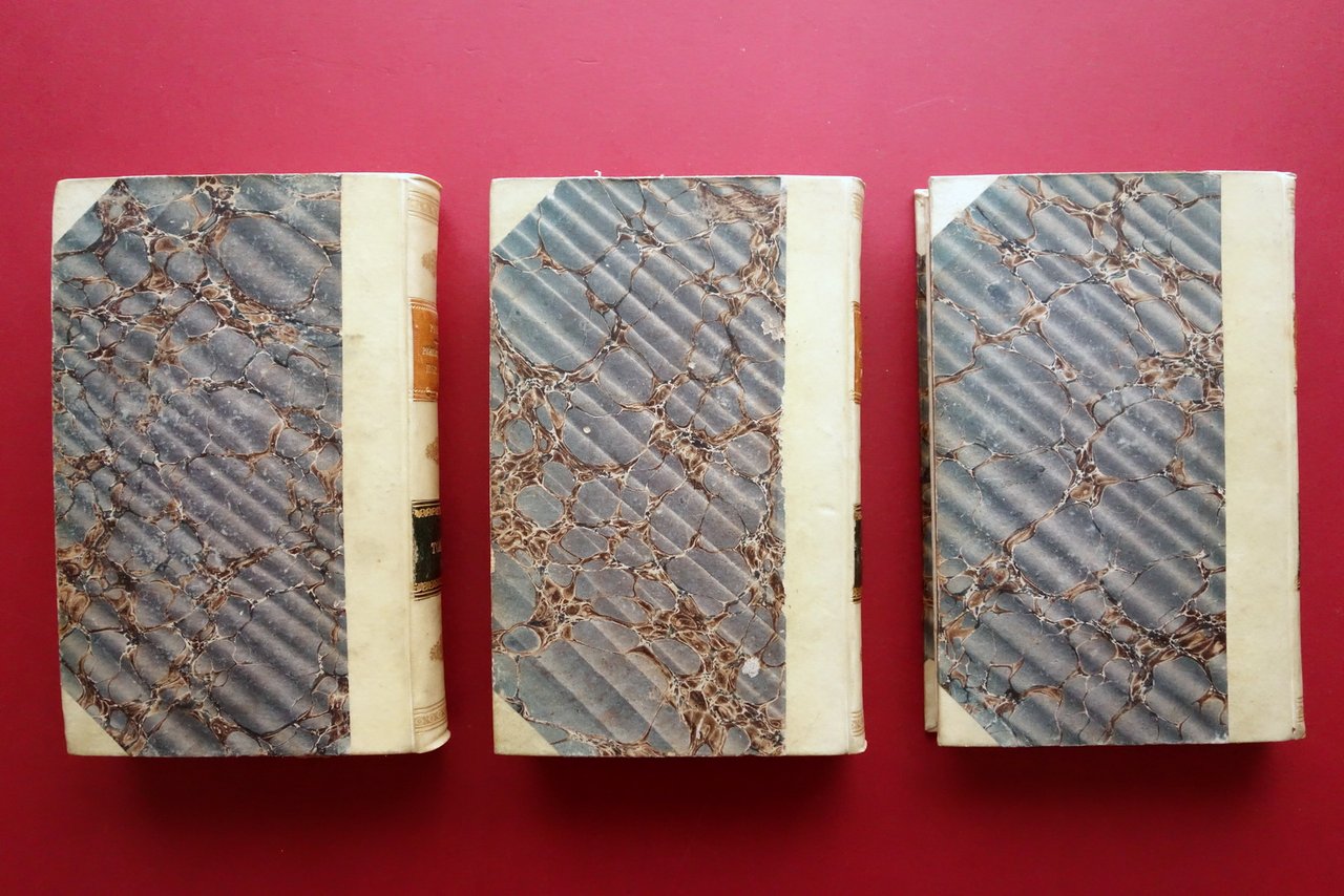 Ioannes Baptista Palma, Praelectiones Historiae Ecclesiasticae quas in Universitate Romana habuit Ioannes Baptista Palma presbyter romanus Historiae Ecclesiasticae Professor Sanctissimi Domini Nostri Pii IX Pontificis Maximi ab epistolis latinis conscribendis [.] tomo I - II - III - opera completa in tre tomi 3 voll.; Typis S. Congregationis de Propaganda Fide, Romae 1848; cm 23x14; pp. 496 (tomo I); pp. 456 (tomo II); pp. 140 (tomo III); pregevole legatura d'epoca in mezza pergamena (dorso e angoli) con titolo e fregi impressi in oro al dorso (titolo e numero del volume impressi entro tasselli in pelle); piatti marmorizzati. Opera completa in tre volumi. Al risguardo anteriore di ciascun volume timbro di vecchia biblioteca, volumi tutti regolarmente annullati. Condizioni di conservazione Buone condizioni con leggere tracce d'uso e del tempo; tagli e pagine con alcune piccole leggere bruniture. Bel trattato di storia della Chiesa, dalle origini al XVI° secolo. Opera completa in tre volumi, pregevolmente rilegati in mezza pergamena (legatura d'epoca). Testi in latino. Prima edizione. SETT210.L24639 N