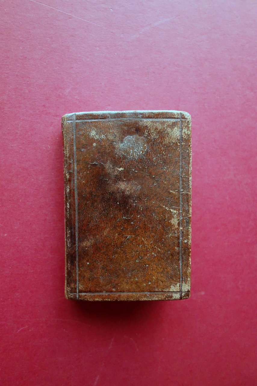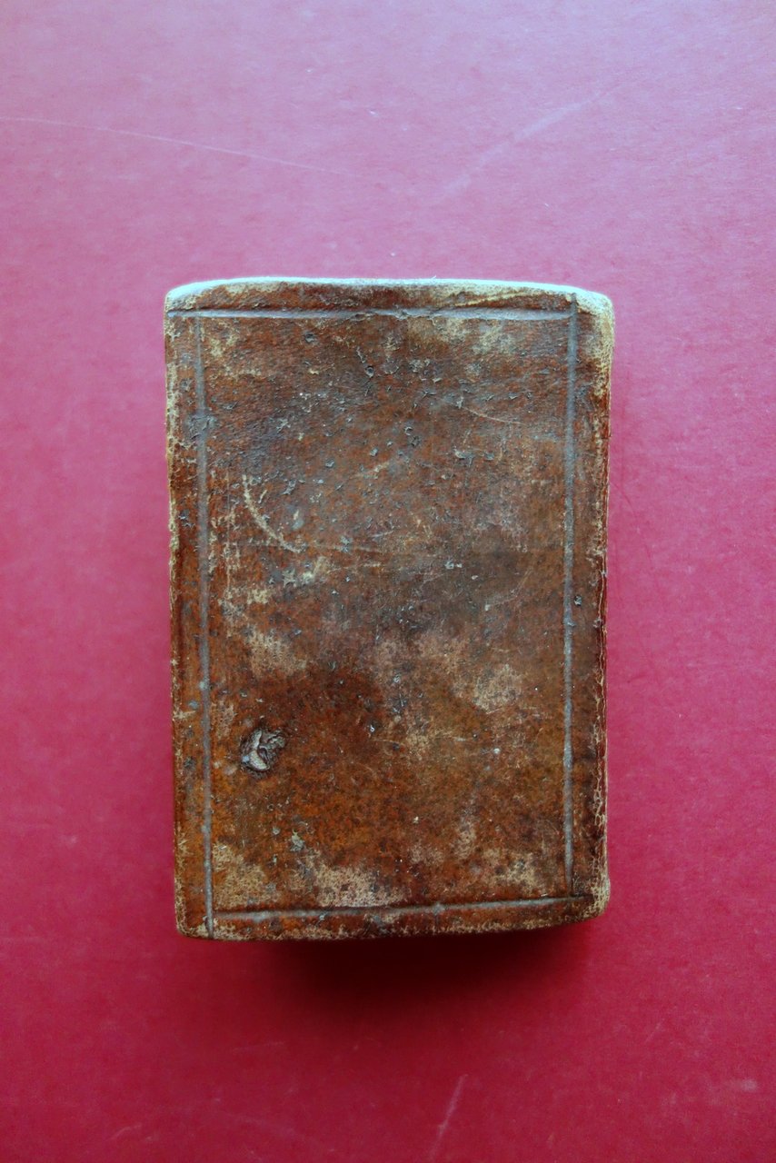 Settecentina, Precationes ante, et post missam dicendae ex missali romano aliisque locis deprompta nunc emendatione, ec auctiores prodeunt Apud Josephum Orlandelli, Venetiis 1792; cm 9,5x6; 2 c. b.; pp. 128; 2 c. b.; capilettera e rubriche rosse; legatura d'epoca in piena pelle muta. Contropiatti in bella carta varese. Condizioni di conservazione Buone condizioni con tracce d'uso e leggeri segni del tempo; coperta con alcune piccole leggere abrasioni e aloni, alla parte superiore del dorso una minuscola mancanza. Interni buoni con alcuni leggeri marginali aloni; pp. 73-74 con una mancanza di qualche cm e conseguente minima perdita di testo (vedi foto); alcune pagine con pieghette / tracce di pieghe agli angoli. SETT158.L25060 N P