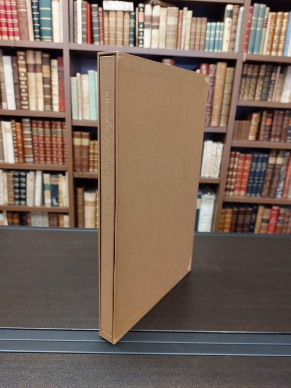 In-4° (cm. 33), carte non numerate, frontespizio in rosso e nero. Brossura editoriale a risvolti, titolo in azzurro al piatto, camicia e cofanetto in tela nocciola (quest'ultimo con piccolissime abrasioni). Edizione composta a mano «da Enrico Tallone» e limitata a 170 esemplari numerati in cifre arabe su carta S. Ilario di Pescia fabbricata espressamente (il nostro n. 70). Cfr. Mavilla p. 142. Ottimo esemplare.