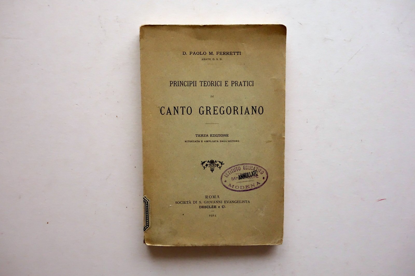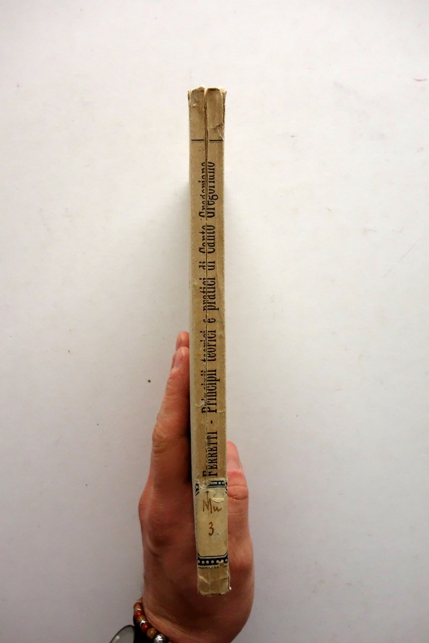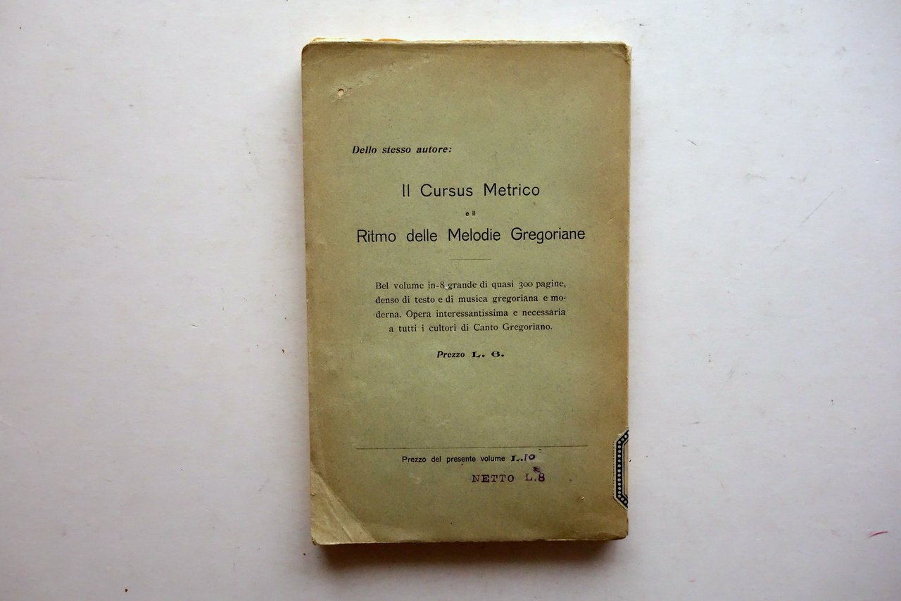 D. Paolo M. Ferretti, Principii teorici e pratici di Canto Gregoriano - terza edizione ritoccata e ampliata dall'autore Società di S. Giovanni Evangelista - Desclee & C., Roma 1914; cm 22x14; pp. 244; brossura ed. Al dorso applicata vecchia etichetta. Alla brossura ant. e al frontespizio vecchio timbro di biblioteca, esemplare regolarmente annullato. Condizioni di conservazione Condizioni complessivamente buone con tracce d'uso, angoli della brossura minimamente sgualciti, brossura post. con una pressoché trascurabile mancanza. Dorso con una fessurazione di alcuni cm e conseguente parziale distacco dell'esemplare in due parti, con conseguente allentamento delle cuciture di qualche fascicolo. Interni buoni. SETT160.L25293 N P