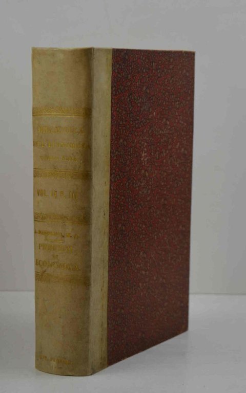 Cm. 23,5, pp. (4) 789 (3). Solida ed elegante legatura di fine '800 in mezza pergamena con piccole punte, dorso liscio con titoli in oro e piatti in carta marmorizzata. Esemplare genuino ed in ottimo stato di conservazione. Volume appartenente alla collana: Biblioteca dell'Economista. Quarta serie vol. nono, parte terza. Oltre al testo di Marshall contiene: P. Leroy-Beaulieu, A. Marshall, G. Schmoller e i loro trattati di economia politica. Prefazione di Pasquale Jannaccone.