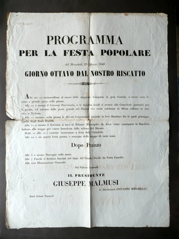 Programma, Programma Per la Festa Popolare del Mercoledì 29 Marzo 1848 Giorno ottavo dal nostro riscatto [.] Eredi Soliani Tipografi, Modena 1848, cm 59,5x45,5, margini alla forma. Condizioni di conservazione Esemplare ben conservato con tracce d'uso, normali pieghe di conservazione, qualche piccola lieve brunitura, tre angoli con minime pieghette, un margine est. con uno strappetto di qualche cm in corrispondenza della piega (vedi foto); pochi minuscoli forellini per precedente affissione. SC03.D12240 N