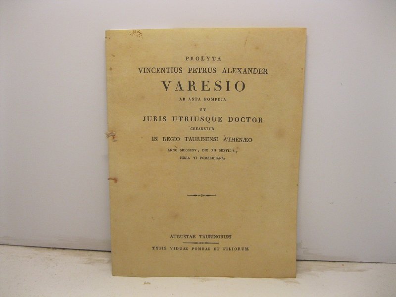Prolyta Vincentius Petrus Alexander Varesio ab Asta Pompeja ut juris utriusque doctor crearetur in Regio Taurinensi Athenaeo anno MDCCCXV, die XII sextilis, hora VI pomeridiana | Libri antichi e moderni | Varesio Vincenzo Pietro Alessandro