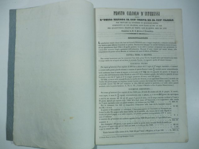 Pronto calcolo d'interessi ossia l'unico metodo il piu' breve ed il piu' facile per trovare gli interessi di qualsiasi somma .Compilato da g, B, Piovano d'Alessandria