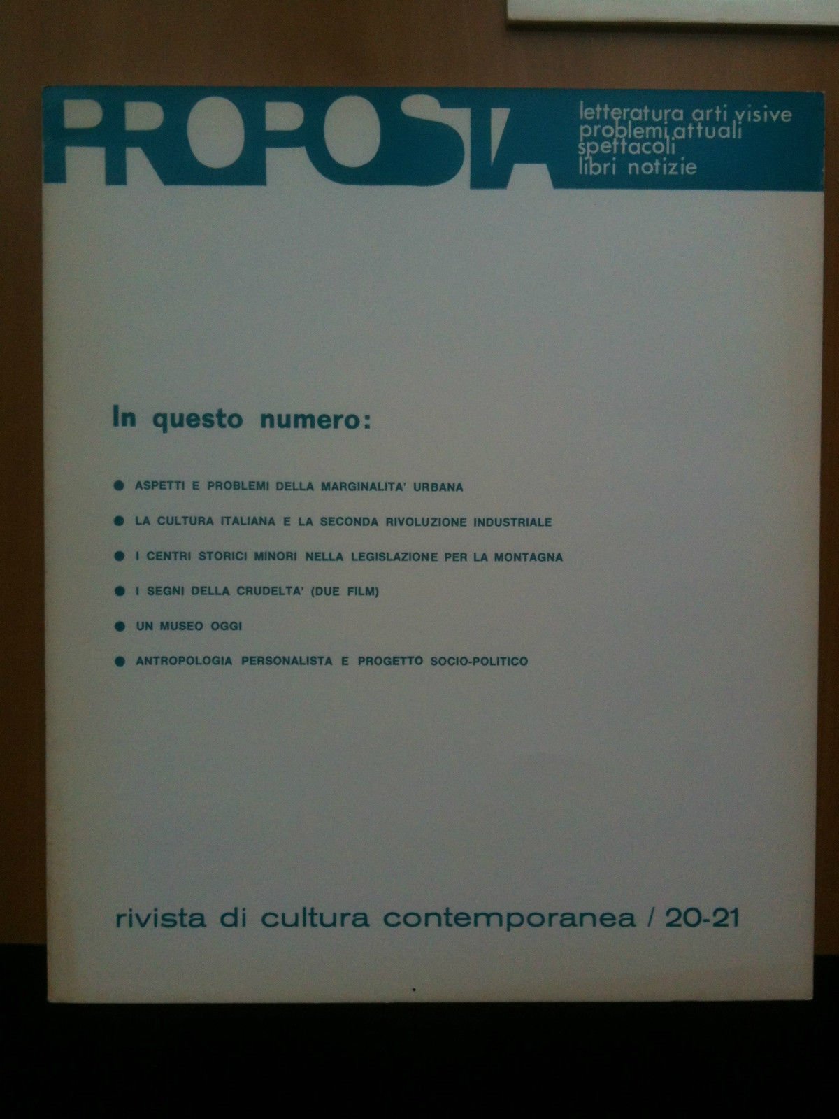 PROPOSTARivista di cultura contemporanea Anno IV N^ 20-21 / luglio - ottobre 1975Stab. Lito-Tipo Editoriale DE MARTINI di G. Ricolo e C. s.a.s. BeneventoDirettore responsabile: Clemente Cassese - Direttore: Antonio PetrilliRedazione: Agostino Lombardi, Biagio Osvaldo Severini, Alberto Abbuonandi, Enrico Narciso, Luigi Telaro, Enzo Esposito, Mimmo Paladino, Mario Coletta, Goffredo Zarro. interno: marginalità urbana, cultura italiana e secunda rivoluzione indistriale, cenrti storici minori nella legislazione per la montagna, I segni della crudeltà (due film), un museo oggi, antropologia personalista e progetto socio-politico rivista in buono statoE1332