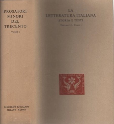 Prosatori minori del Trecento. Tomo I:Scrittori di religione. Contiene testi dei seguenti autori:Giordano da pisa. Ugo Panciera. Domenico Cavalca. Bartolomeo di San Concordio. Iacopo Passavanti, Giovanni Colombini. Santa aterina da Siena. Giovanni dalle Celle. Anonimo. Lapo Mazzei. Girolamo da Siena. Filippo degli Agazzari. Scritture spirituali, Volgarizzamenti: Sant'atanasio, San Giovanni Crisostomo, San Girolamo, Sant'Agostino, Cassiano, San Gregorio MAgno, Abate Isacco, Sant'Atto di Pistoia, Giovaani da Fecamp, Sant'Anselmo, Gugliemo di Sant- Thierry,