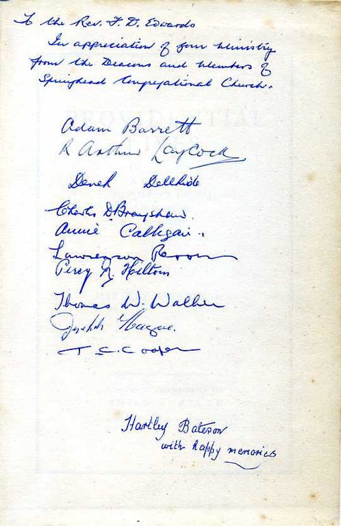 Inscription on front end paper from the Author to the Church Minister, also signed by ten other of the Church's Officers. All are shown in a photograph in the book. No other marks or inscriptions to contents. No creasing to covers or to spine. A very clean very tight copy with faded unmarked boards and spine, very minor foxing and no bumping to corners. 52pp. Presentation copy specifically for the Minister of the one hundred and fifty year history of the Oldham Congregationalist Church.