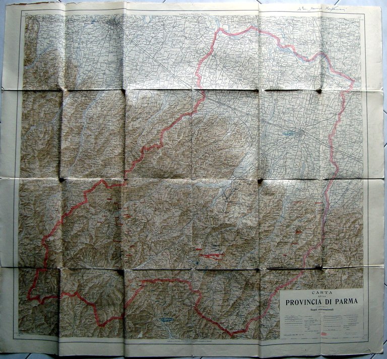 Istituto Geografico Militare, Carta della Provincia di Parma Scala chilometrica 1: 100.000 IGM (Istituto Geografico Militare),1929 Anno VII; grande carta rip. pi√π volte con legenda al margine inf.; nome del precedente proprietario scritto a penna al margine sup. Cm 89x100 (aperta); cm 23x18,5 (chiusa). Condizioni di conservazione Esemplare ben conservato con tracce d'uso; pieghe di conservazione con strappetti e piccole mancanze; qualche cerchiarura e sottolineatura a pastello rosso e bl√π; margini con piccoli taglietti; per dettagli vedi foto. OPEB.5151 blu