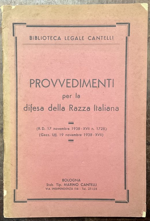 Provvedimenti per la difesa della razza italiana. R. D. 17 novembre 1938 – XVII, n. 1728. Biblioteca legale Cantelli | Libri antichi e moderni |
