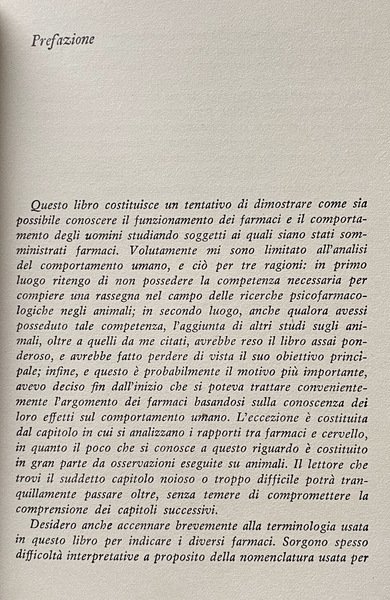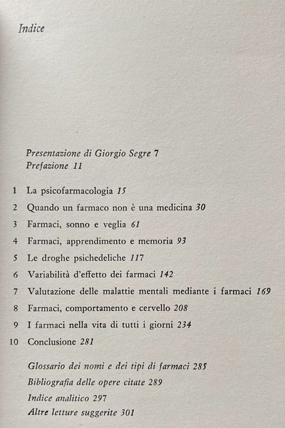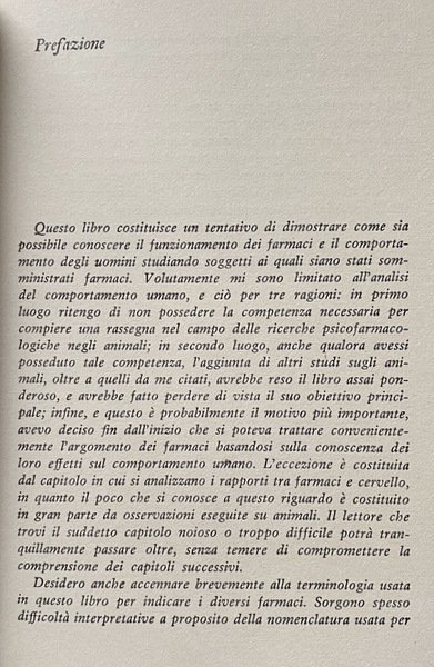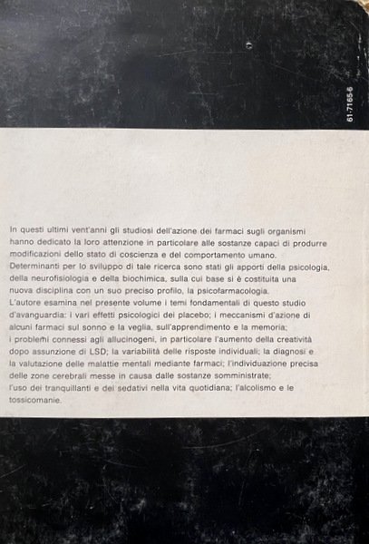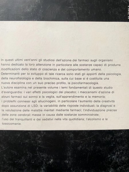L'autore esamina nel presente volume i temi fondamentali di questo studio d'avanguardia: i vari effetti psicologici dei placebo; i meccanismi d'azione di alcuni farmaci sul sonno e la veglia, sull'apprendimento e la memoria; i problemi connessi agli allucinogeni, in particolare l'aumento della creatività dopo assunzione di LSD; la variabilità delle risposte individuali; la diagnosi e la valutazione delle malattie mentali mediante farmaci; l'individuazione precisa delle zone cerebrali messe in causa dalle sostanze somministrate; l'uso dei tranquillanti e dei sedativi nella vita quotidiana; l'alcolismo e le tossicomanie.