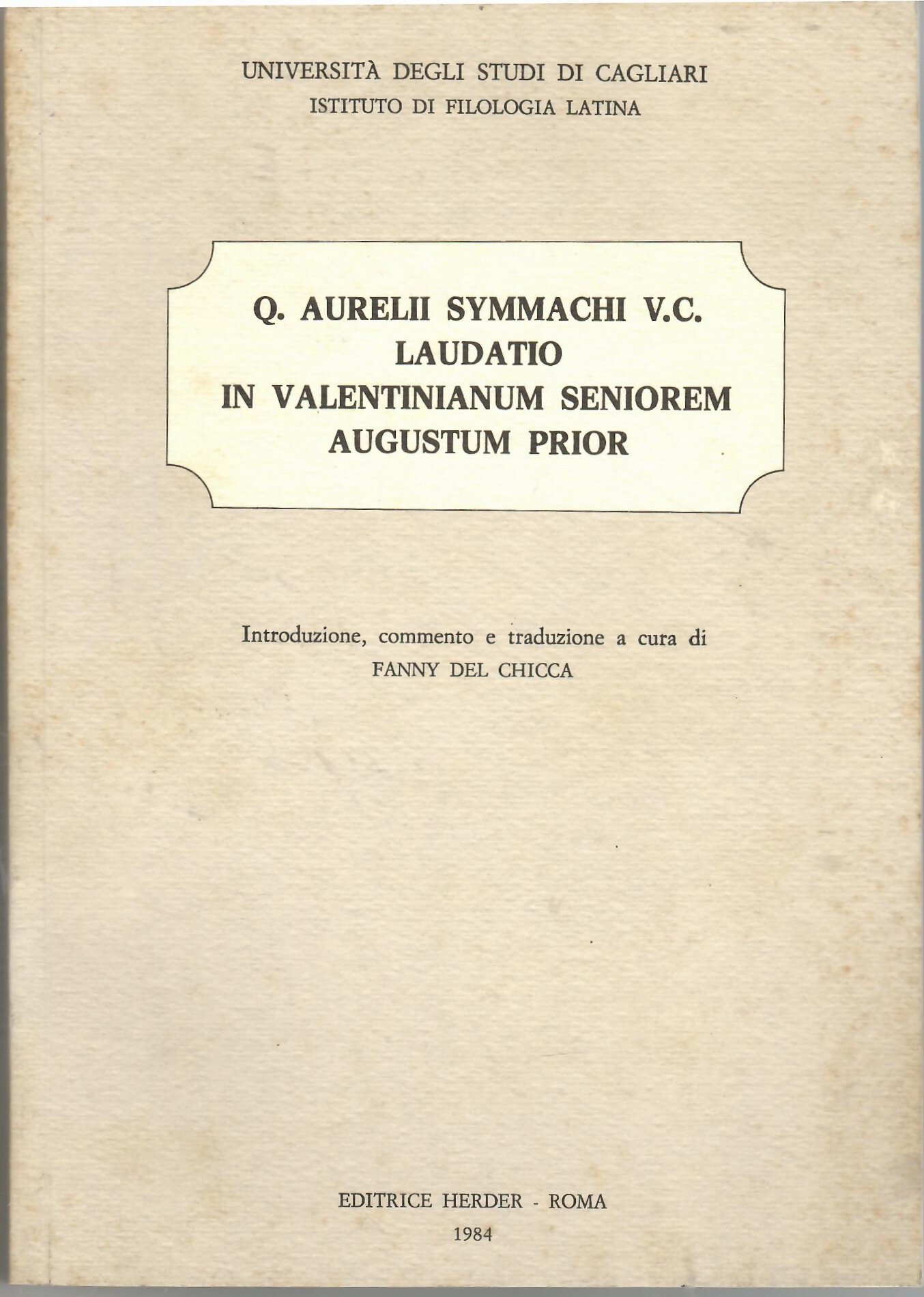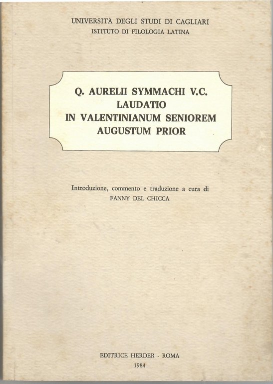 Brossura editoriale di pagine 272, bruniture ai piatti e ai tagli, interno in perfette condizioni. Dedica della curatrice in apertura. Opera in buone/ottime condizioni. Spedizione entro 24 ore dalla conferma dell'ordine. La Laudatio in Valentinianum seniorem Augustum prior è un panegirico di Quinto Aurelio Simmaco pronunciato a Treviri il 25 febbraio 369 per celebrare i quinquennalia e il terzo consolato dell'imperatore Valentiniano I. Il discorso, di cui resta una parte significativa, traccia la biografia dell'imperatore dall'infanzia all'ascesa al trono, celebrandone le virtù militari e la politica.