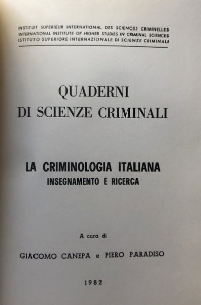 QUADERNI DI SCIENZE CRIMINALI. LA CRIMINOLOGIA ITALIANA. INSEGNAMENTO E RICERCA. A CURA DI GIACOMO CANEPA, PIERO PARADISO | Libri antichi e moderni |