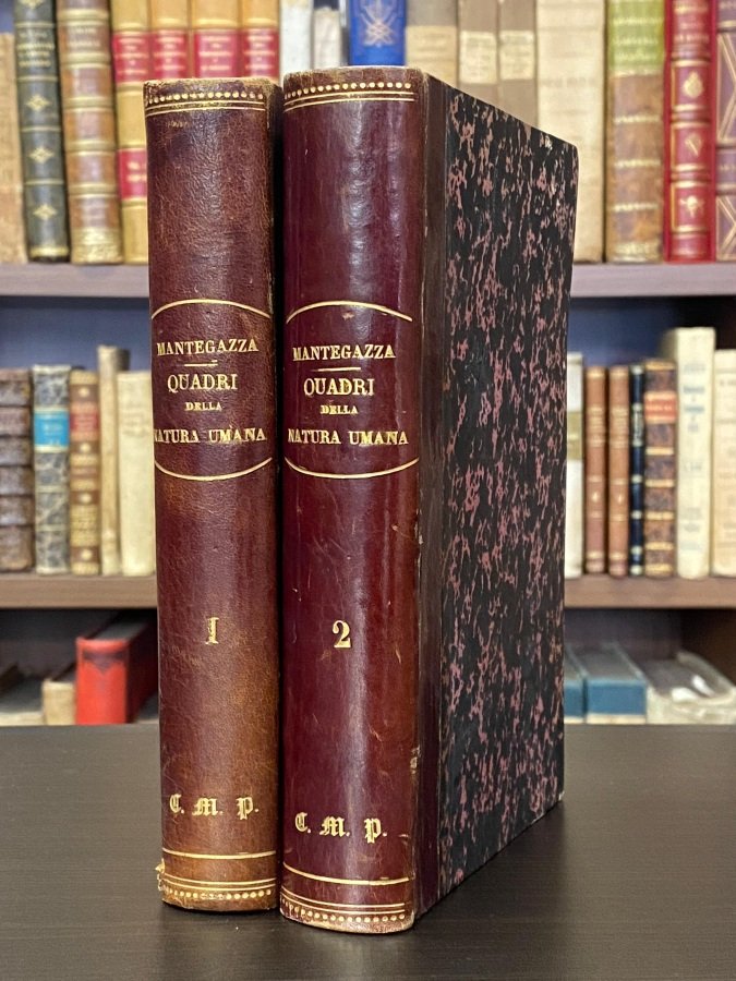 <span style="font-style: normal;">2 volumi in-16° (cm. 18,3), legature coeve in mezza pelle, dorsi lisci con titoli e filetti in oro e iniziali «C.M.P.» sempre in oro al piede, piatti marmorizzati (alcune abrasioni al volume I e lievi tracce d'uso); pp. 545 [1b], 695 [1b] in ottimo stato (</span><i>Ex Libris</i> impresso a secco all'occhietto del vol. I). Prima edizione di questo interessantissimo studio antropologico sugli effetti di vino, caffè, haschisch, cocaina, ecc.; con una visione di storia delle deviazioni umane del Mantegazza, pioniere degli studi sull'abuso di droghe. In fine vi è una parte di storia del vino con una accurata classificazione dei vini italiani, europei ed extraeuropei. Esemplare molto buono. (NK4)