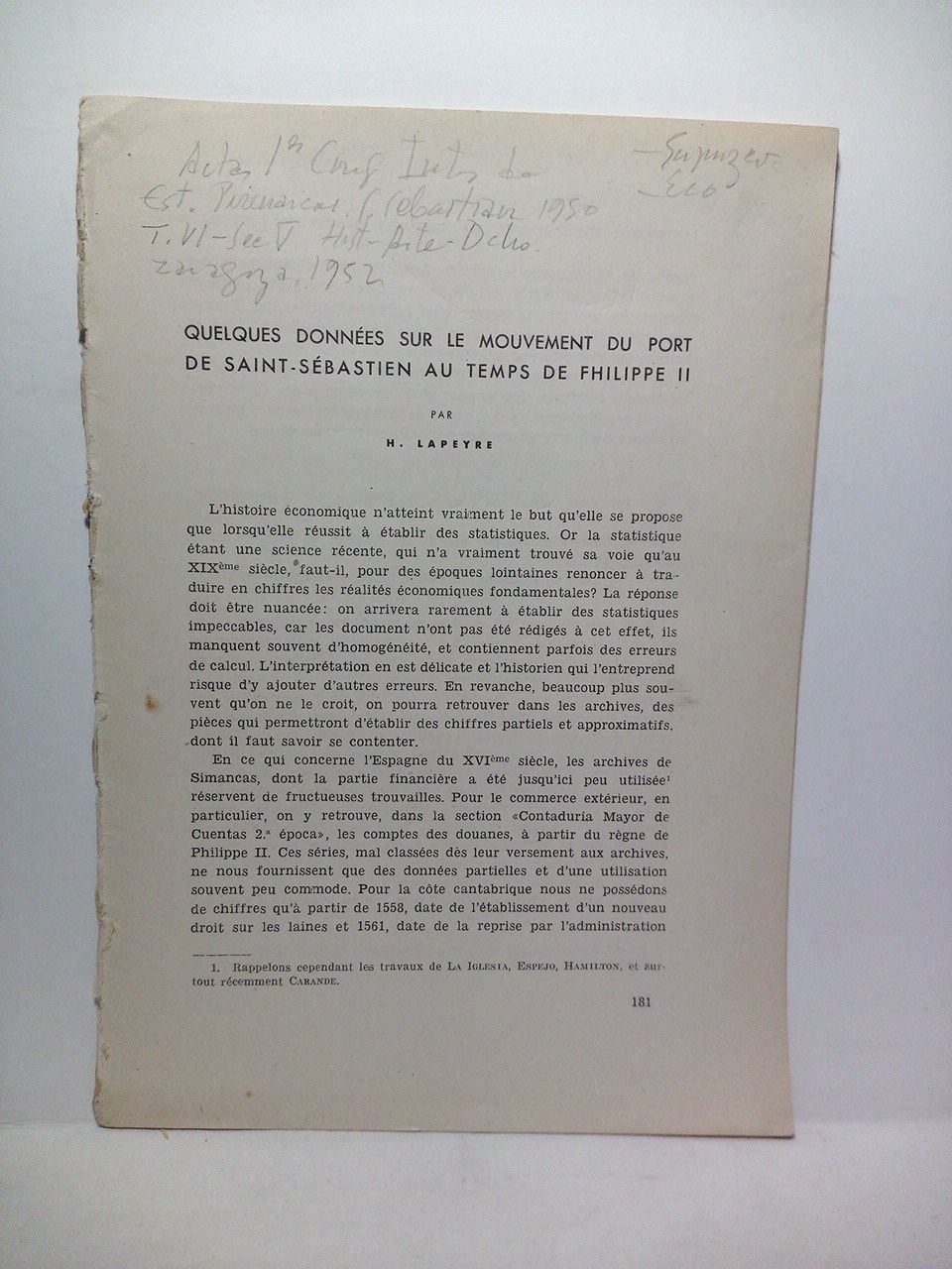 Quelques données sur le mouvement du port de Saint-Sébastien au temps de Fhilippe II | Libri antichi e moderni | Lapeyre, H.