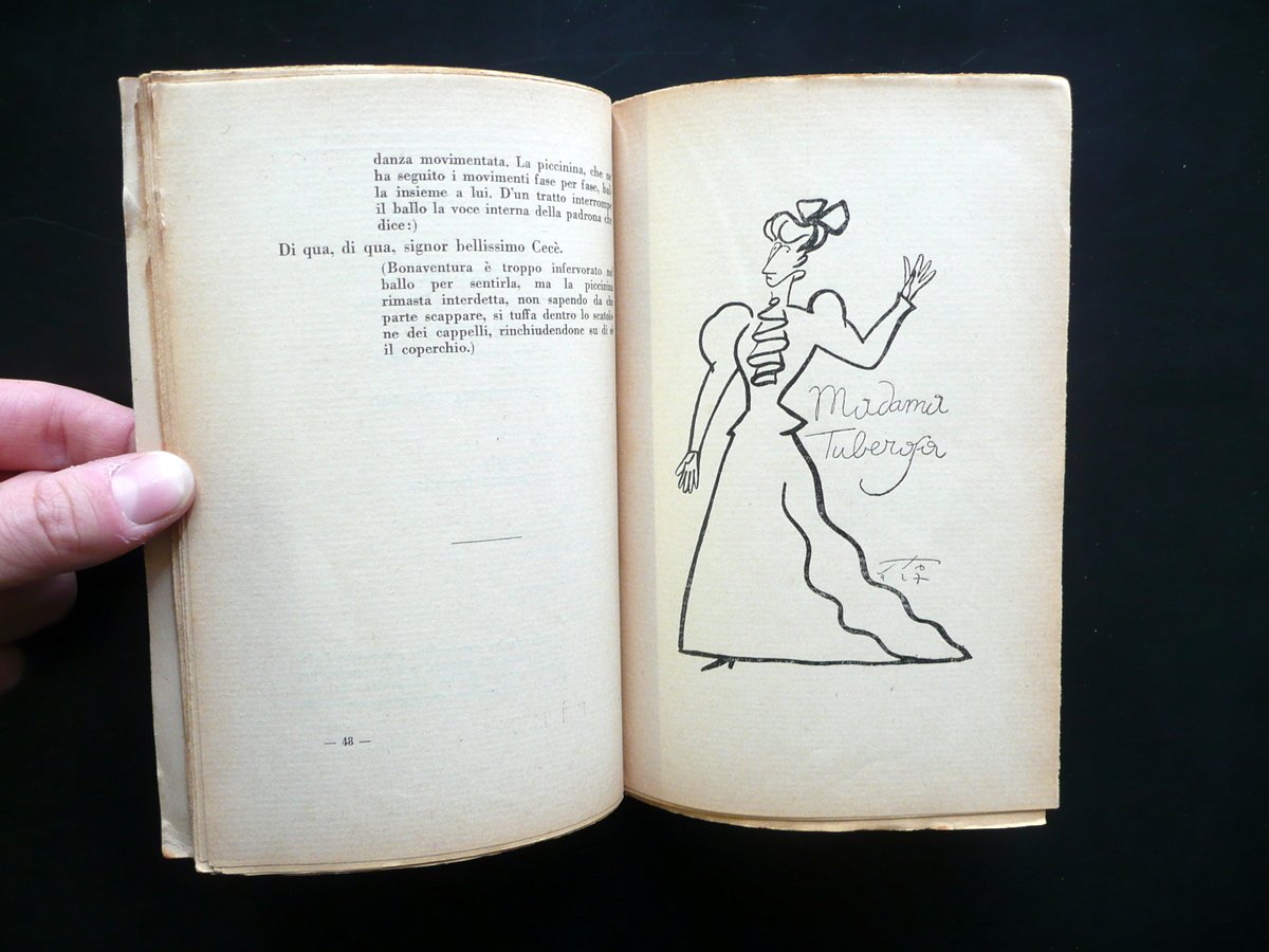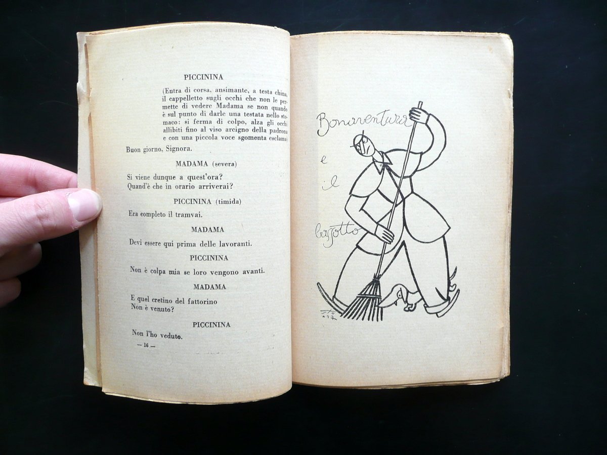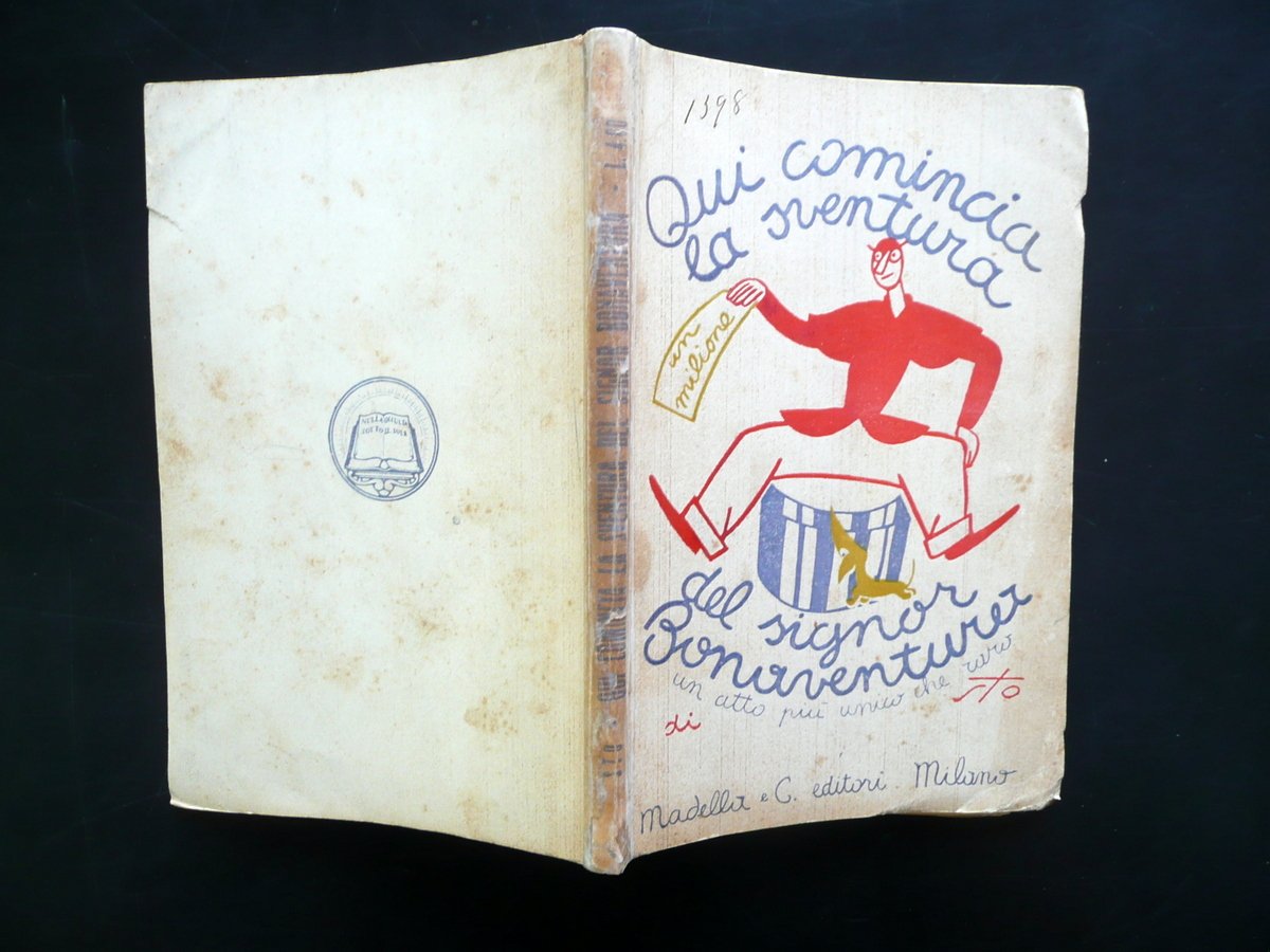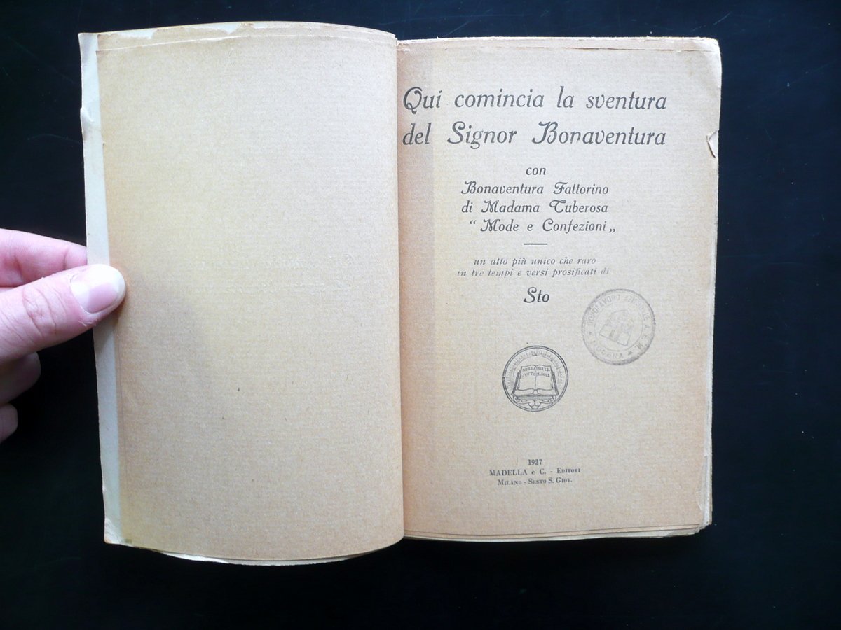 Sto (Sergio Tofano), Qui comincia la sventura del Signor Bonaventura con Bonaventura Fattorino di Madama Tuberosa Mode e confezioni" un atto pi√π unico che raro in tre tempi e versi prosificati di Sto Madella & C. Editori, Milano - Sesto S. Giov. 1927; cm 19x13; 136 con varie belle ill. in b/n fuori t.; brossura ed. ill. a colori. Frontespizio con vecchio timbretto. Condizioni di conservazione Esemplare ben conservato con tracce d'uso, leggermente ingiallito a causa del tipo di carta e con alcune piccole leggere bruniture; dorso fessurato con alcuni strappetti, ma restaurato mediante l'applicazione di nastro adesivo; esemplare compatto. Raro libretto originale per l'infanzia, scritto e illustrato da Sergio Tofano. OPEB.3856 N "