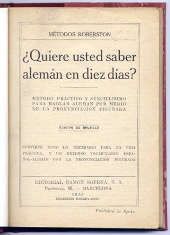 ¿Quiere usted saber alemán en diez días?. Método práctico y sencillísimo para hablar alemán por medio de la pronunciación figurada. Contiene todo lo necesario para la vida práctica y un extenso Vocabulario español-alemán con la pronunciación figurada.