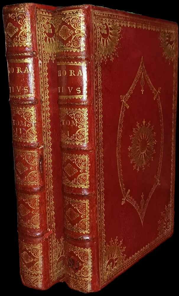 2 volumi, 23 cm, in 8°, bella rilegatura coeva in marocchino rosso, ricchi in oro fregi ai piatti e dorso a cinque nervi con titolo su tassello, tagli dorati con fregi geometrici dentellati che riprendono le decorazioni in oro delle unghie, carte di guardia marmorizzate. Vol. I: p. (32), 176, (3), 178-264 (2). Vol. II: p. (24), 48, (3), 50-94, (3), 96-152, (3), 154-172, (3), 174-191, (15). Opera stampata interamente incisa, sia il testo che le vignette, con centinaia di illustrazioni, testine, finalini e capolettera differenti. Esemplare della prima tiratura con al medaglione di p. 108 del secondo volume recante la scritta "Post. Est." (cfr. opac variante A). Entrambi i volumi riportano l'elenco dei sottoscrittori, nel primo volume spiccano i nomi di personaggi come Guglielmo Augusto di Hannover duca di Cumberland, Guglielmo IV d'Orange-Nassau e Federico, principe di Galles, oltre a centinaia di personalità britanniche ed europee. Nel secondo volume i sottoscrittori sono ancora più numerosi a testimonianza del successo dell'opera tipografica del Pine e si aggiungono alla liste dei sottoscrittori: il gran duca di Toscana (Francesco Stefano di Lorena), il Re di Francia Luigi XV, l'imperatore Carlo V, i reali di Spagna, Portogallo ed Austria. Alle risguardie due ex libris coevi, alle armi del Conte Giuliano Monaldini di Ravenna, inciso su rame, al verso dei due frontespizi, altri ex libris di collezionista del XX secolo con veduta dell'antica città di Bologna. Qualche rarissima e tenue fioritura. Qualche segno del tempo alle rilegature, più marcate nel secondo volume, ma nel complesso esemplare ottimamente conservato, dagli ampi margini.