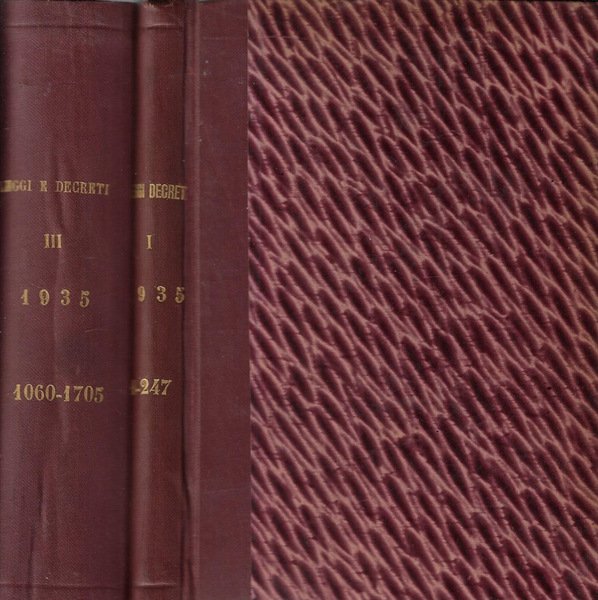 Opera incompleta composta da due volumi anno 1935, Vol. I e III della raccolta ufficiale delle leggi e dei decreti del Regno d'Italia; edizione economica, volumi successivamente rilegati. Segni a matita al frontespizio di ambo i tomi. Coperte rigide ed ingiallite dal tempo presentanti segni di usura da scaffale ai margini e leggere tracce di usura da sfregamento ai piatti. Pagine brunite dal tempo, in particolare ai tagli e sporadicamente fiorite. Numerazione delle pagine consecutiva tra le uscite. Numero pagine complessive n.n.