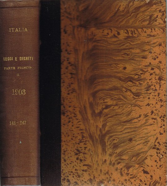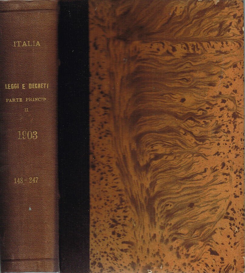 Volume Secondo completo, Anno 1903, dal No. 148 al 247, della collana Raccolta Ufficiale delle Leggi e dei Decreti del Regno d'Italia - Parte Principale. Volume intonso dei primi del '900 in 8.o, stato discreto, rilegato con coperta, non coeva, in mezzatela goffrata, piatti marmorizzati, sul dorso caratteri dorati in bassorilievo, bordo appena sfregato, abrasioni, ammaccatura, dorso lievemente scolorito, fioritura sparsa, tagli un po' ambrati con barbe, quello di testa brunito, pagine discretamente conservate, alcune e margini un po' ambrati, presenza di gora. Presenta catalogazione bibliotecaria in parte manoscritta e timbro "Cambio" su occhiello. Numero Pagine 912, numerazione delle pagine in sequenza