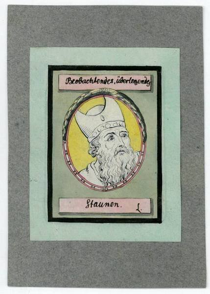 Ca. 75:95 mm (Plattenrand 59:79 mm). Originales Handkolorit in schwarzer Tuschumrahmung (das Portrait weiß), auf blaugrauen Kartonträger aufgezogen. Hübsches Beispiel für Lavaters Physiognomien, hier bezeichnet "Beobachtendes, überlegendes Staunen". - Lavater versuchte, die Physiognomik gleichsam zu einer Wissenschaft vom inneren Menschen zu erheben: Aus der Bildung der äußeren Körperteile, besonders des Gesichts, sollte auf die seelischen Eigenschaften geschlossen werden. Sein theoretisches Werk dazu, das 1775-78 erschien, hatte außergewöhnlichen Einfluss auf viele Zeitgenossen, außer auf Herder und Jacobi auch auf seinen zeitweiligen Freund Goethe, während Lichtenberg ("Fragment von Schwänzen") und Nicolai Lavaters orakelhafte Theorien heftigst kritisierten.
