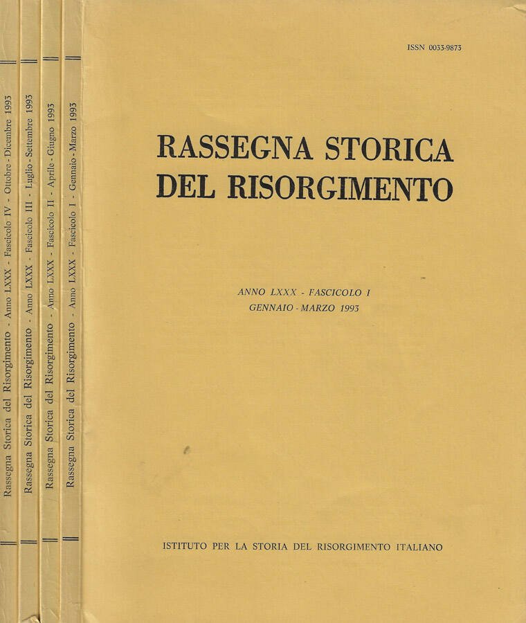 Opera completa della pubblicazione trimestrale Rassegna storica del Risorgimento, composta da 4 esemplari. Anno LXXX- fascicolo I-II-III-IV dal gennaio al dicembre 1993. Brossure in buono stato, presentano segni di usura, aloni, risvolti, strappi alle estremità, testo completamente fruibile. Pagine in buono stato, alcune sottolineate e scritte a matita, tagli non precisi. Numero pagine 584 con numerazione successiva