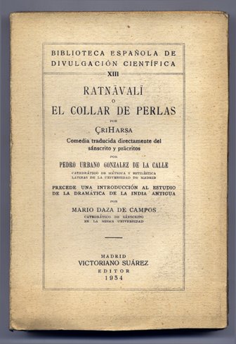 Ratnavali ó El Collar de Perlas. Comedia traducida directamente del sánscrito y pracritos por Pedro Urbano González de la Calle. Introducción al estudio de la dramática de la India antigua por Mario Daza de Campos.