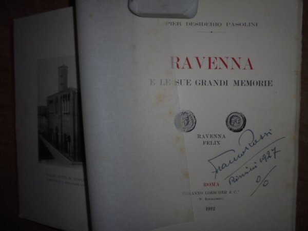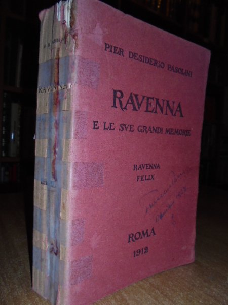 Pasolini, Pier Desiderio. Ravenna, Ermanno Loescher, 1912. Ravenna e le sue grandi memorie. In-8°, br., dorso sdrucito (legatura da rifare). vi, 407, (5) pp. con 241 illustrazioni n.t. e in tavole f.t. protette da veline. Una firma nel frontespizio. Opera pregevole ricercata. Neg. Mob 2.