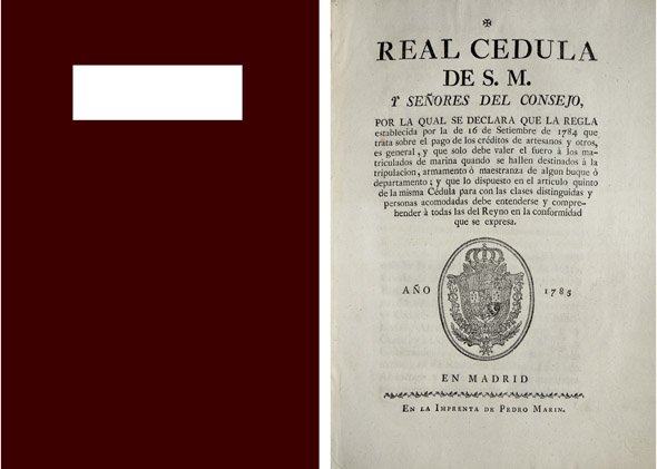 Real Cédula de S.M. y Señores del Consejo por la qual se declara que la regla establecida por la de 16 de Setiembre de 1784 que trata sobre el pago de los créditos de Artesanos y otros es general, y que solo debe valer el fuero a los Matriculados de Marina quando se hallen destinados a la tripulacion, armamento o maestranza de algun buque. Y que lo dispuesto en el artículo quinto de la misma Cédula para con las clases distinguidas y personas acomodadas debe entenderse y comprehender a todas las del Reyno.