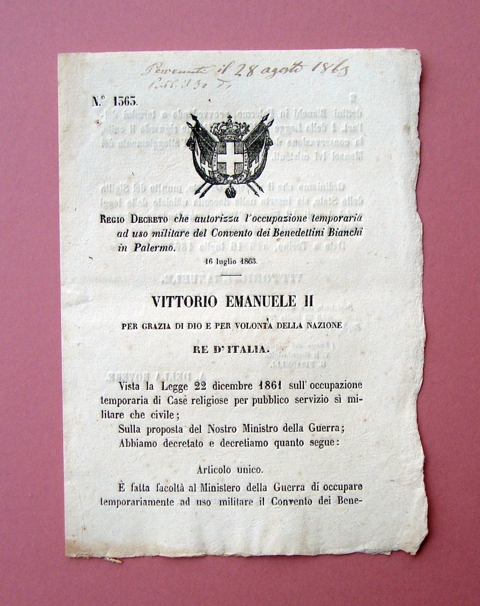 Regio Decreto Palermo Occupazione temporaria uso Militare Convento Bianchi 1863 | Libri antichi e moderni |