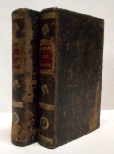 Madrid, Imprenta de Collado, 1816. Dos volúmenes en 8vo.; XII pp., 340 pp. y 355 pp. y dos planos plegados. Taladros en el margen superior de las primeras páginas del tomo primero afectando alguna letra y puntuales en el márgen blanco. Encuadernación de época en piel, con lomeras ornadas y tejuelos, con roces en planos y lomera.