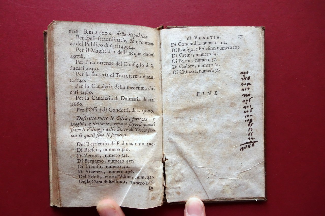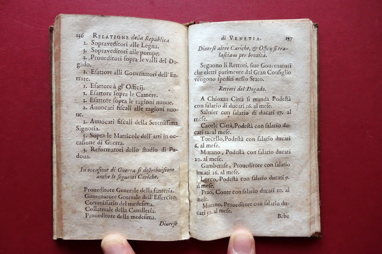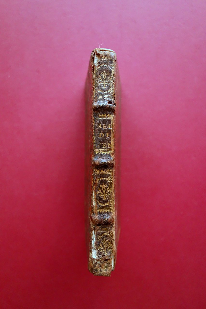 Seicentina, † Relatione della citt‡ e republica di Venetia nella quale sono descritti li principii di sua edificatione, avanzamenti, acquisti e perdite fatte, governo, riti, costumi, dominio forze, erario, adherenze con prencipi e diferenze con gl'Elettori dell'Imperio per causa di Precedenza Appresso Pietro del Martello, in Colonia 1672; cm 14x8; pp. [8]-172; frontespizio con marca tipografica inc. in b/n. Legatura d'epoca in piena pelle con titolo e bei fregi impressi in oro al dorso con nervature.† † Condizioni di conservazione Buone condizioni†con tracce d'uso e leggeri segni del tempo; coperta con alcune piccole abrasioni e qualche minima / piccola marginale mancanza al piatto ant., alle cuffie e alle cerniere. Interni buoni con leggero foxing; margine destro di alcune pagine con lieve ombra di gora che non compromette il testo; da pagina 100 in poi il margine interno presenta pochi minimi forellini (danni da insetto) che non interessano il testo, da pagina 124 in poi restaurati mediante applicazione di piccola braghetta cartacea (vedi foto). † Molto raro. † SETT154.L24122 N P