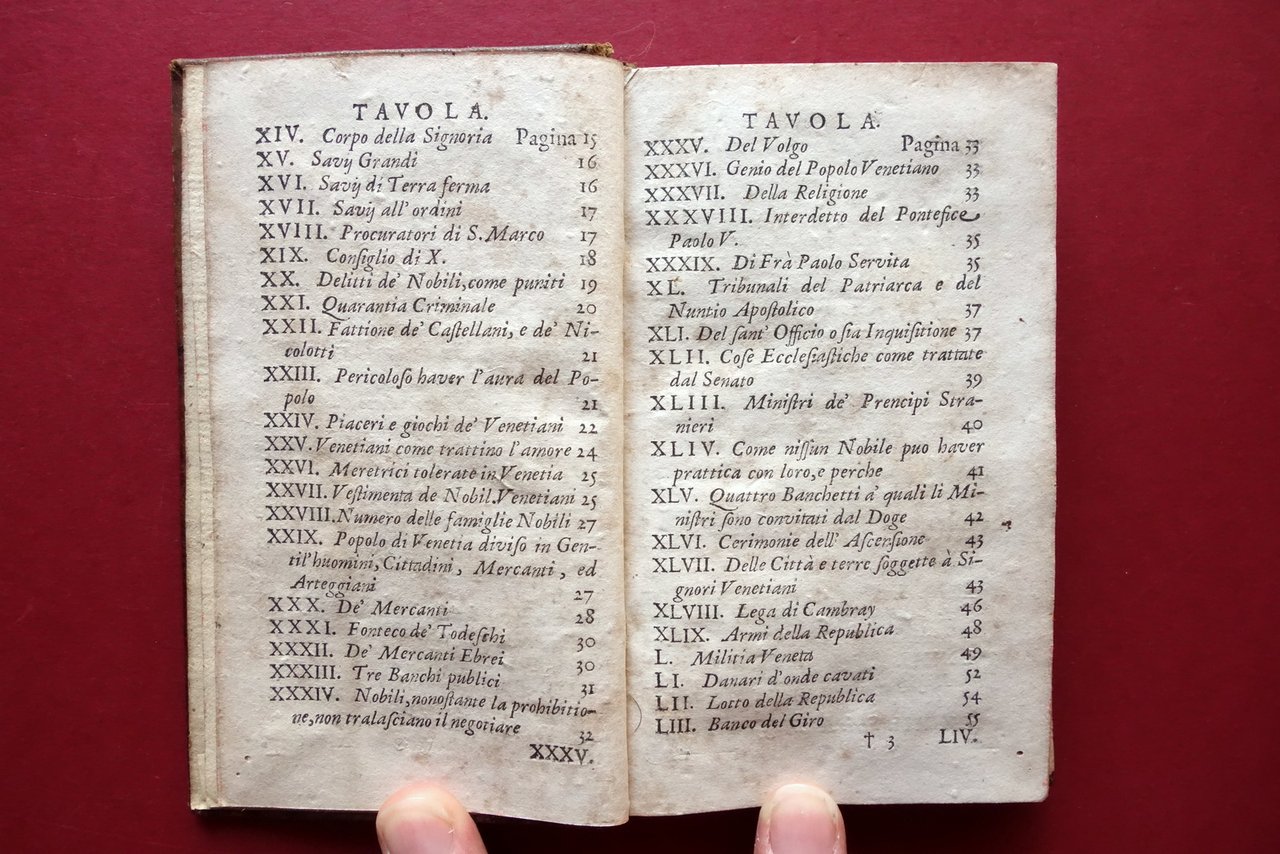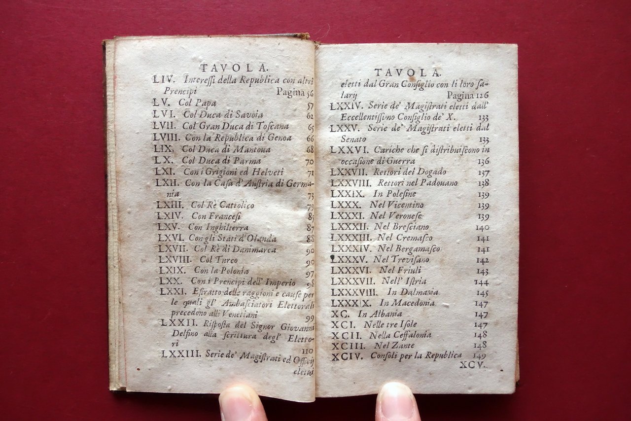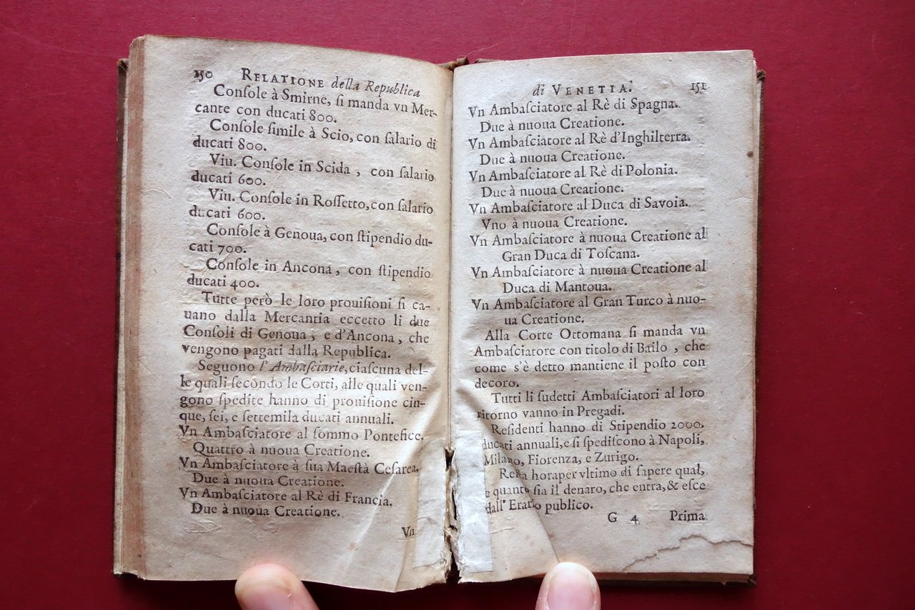 Seicentina, † Relatione della citt‡ e republica di Venetia nella quale sono descritti li principii di sua edificatione, avanzamenti, acquisti e perdite fatte, governo, riti, costumi, dominio forze, erario, adherenze con prencipi e diferenze con gl'Elettori dell'Imperio per causa di Precedenza Appresso Pietro del Martello, in Colonia 1672; cm 14x8; pp. [8]-172; frontespizio con marca tipografica inc. in b/n. Legatura d'epoca in piena pelle con titolo e bei fregi impressi in oro al dorso con nervature.† † Condizioni di conservazione Buone condizioni†con tracce d'uso e leggeri segni del tempo; coperta con alcune piccole abrasioni e qualche minima / piccola marginale mancanza al piatto ant., alle cuffie e alle cerniere. Interni buoni con leggero foxing; margine destro di alcune pagine con lieve ombra di gora che non compromette il testo; da pagina 100 in poi il margine interno presenta pochi minimi forellini (danni da insetto) che non interessano il testo, da pagina 124 in poi restaurati mediante applicazione di piccola braghetta cartacea (vedi foto). † Molto raro. † SETT154.L24122 N P