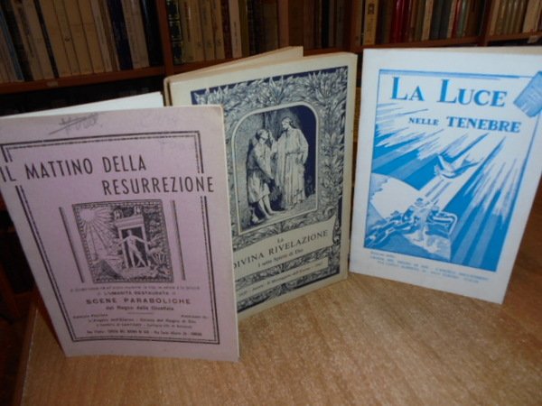 (Religione evangelica) RACCOLTA di nove volumi ed opuscoli comprendente le opere seguenti: La Divina Rivelazione. I sette Spiriti di Dio. Vol. I. La Nuova Terra. Il Libro del Ricordo. La Legge universale. Il Giorno della Liberazione. 2 copie. Vol. III. La Vita eterna. Il Tabernacolo in mezzo agli uomini. Il ristabilimento d' ogni cosa. 2 copie. Rugiada del Cielo. Venga il tuo Regno. La Luce nelle tenebre. Il Mattino della resurrezione. Volumi ed opuscoli in br. e rilegati pubblicati dal 1945 al 1981. Tutti euro 60. Ben conservati. Uff. scat. 8