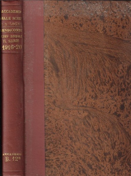 Quattro annate in 4 uscite successivamente rilegate in un unico volume del rendiconto delle sessione della R. Accademia delle Scienze rispettivamente dall'anno 1916 al 1920. La rilegatura ha mantenuto internamente il piatto anteriore dei fascicoli. Pagine brunite dal tempo con occasionali fogli intonsi. Bordi a barbe cotti e logorati non impedenti la fruibilità. Segno a penna ed a matita al frontespizio. Il volume potrebbe contenere timbri ed etichette dell'Istituto Veneto, regolarmente acquisito dalla nostra libreria. Coperta rigida in mezza tela con titoli oro al dorso ingiallita dal tempo presentante segni di usura ai margini e tracce di usura da sfregamento ai piatti; sporadiche gore chiare dovute a lieve umidità precedente ai piatti. Da segnalare leggera ondulazione dei fogli dovuta alla naturale umidità dei secoli. Numerazione delle pagine divisa per volume. Numero pagine complessive n.n.