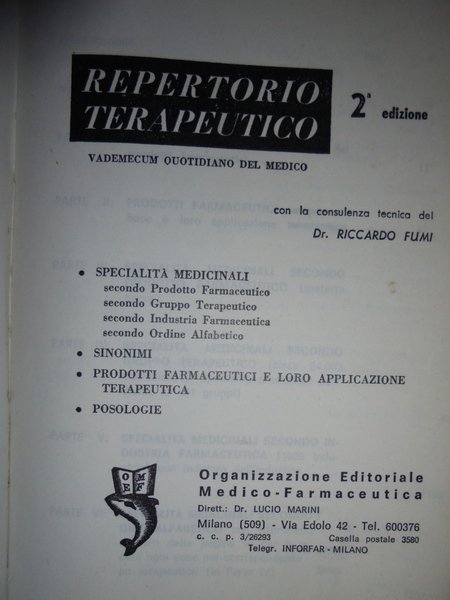 DR. FUMI, RICCARDO - MILANO, ORGANIZZAZIONE EDITORIALE MEDICO-FARMACEUTICA, 1965. IN-16°, CARTONCINO EDIT., 1313 PP. SECONDA EDIZIONE. BEN CONSERVATO. Neg. magaz. mob. bianco
