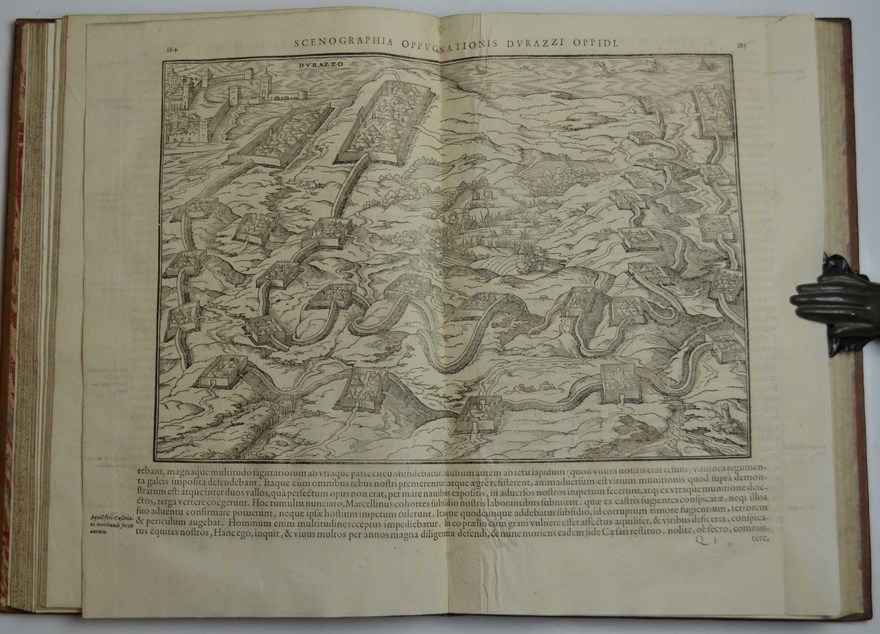 Due parti in un volume in-folio (cm. 37), pp. (24) 265 (27) 35 (1) 207 (1). Marchio tipografico al frontespizio, grande stemma alla dedica, capolettera figurati e molte grandi incisioni xilografiche (di cui due a doppia pagina). Solida e raffinata legatura d'inizio settecento in piena pelle, dorso a nervi con ricchi fregi in oro, piatti decorati da motivi concentrici. Esemplare genuino ed in eccellente stato di conservazione. Si tratta senz'altro di una delle più belle edizione di questo classico della storiografia antica. Ricercato soprattutto per l'ampio apparato iconografico che offre le vedute di molte città coinvolte nei fatti storici commentati da Cesare tra cui (Alessandria, Besancon, Brindisi, Marsiglia, Gergovia oggi Clemont-Ferrand, Alesia, Burges, Durazzo, ecc...).
