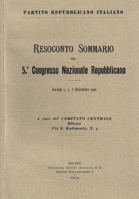 Resoconto del quinto Congresso Nazionale Repubblicano tentosi a Ancona dall'1 al 3 novembre 1901, a cura del Comitato Centrale del PRI. Libretto rilegato filo refe con coperta in cartoncino striato molto ben preservato. Pagine integre e non danneggiate dal tempo, tonalità ossidate vintage, bruniti i tagli. N. pag. 79.