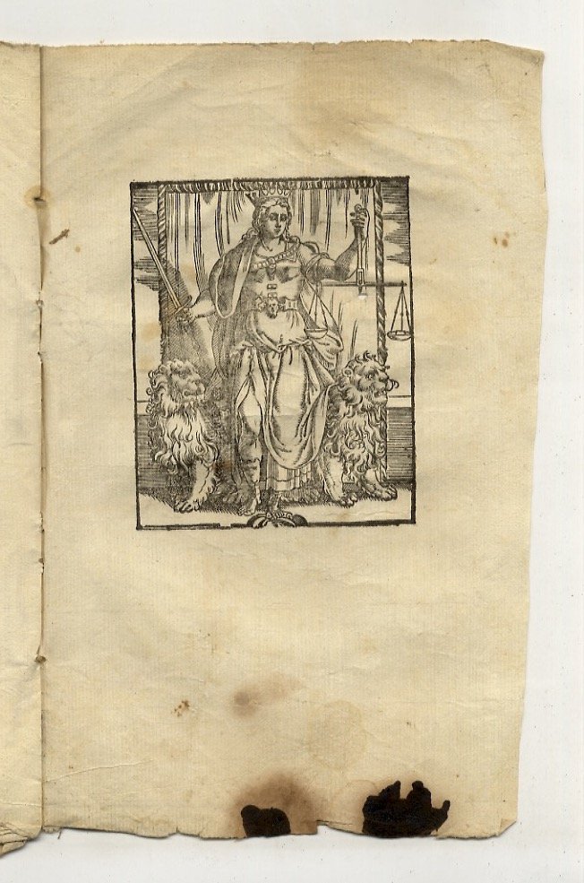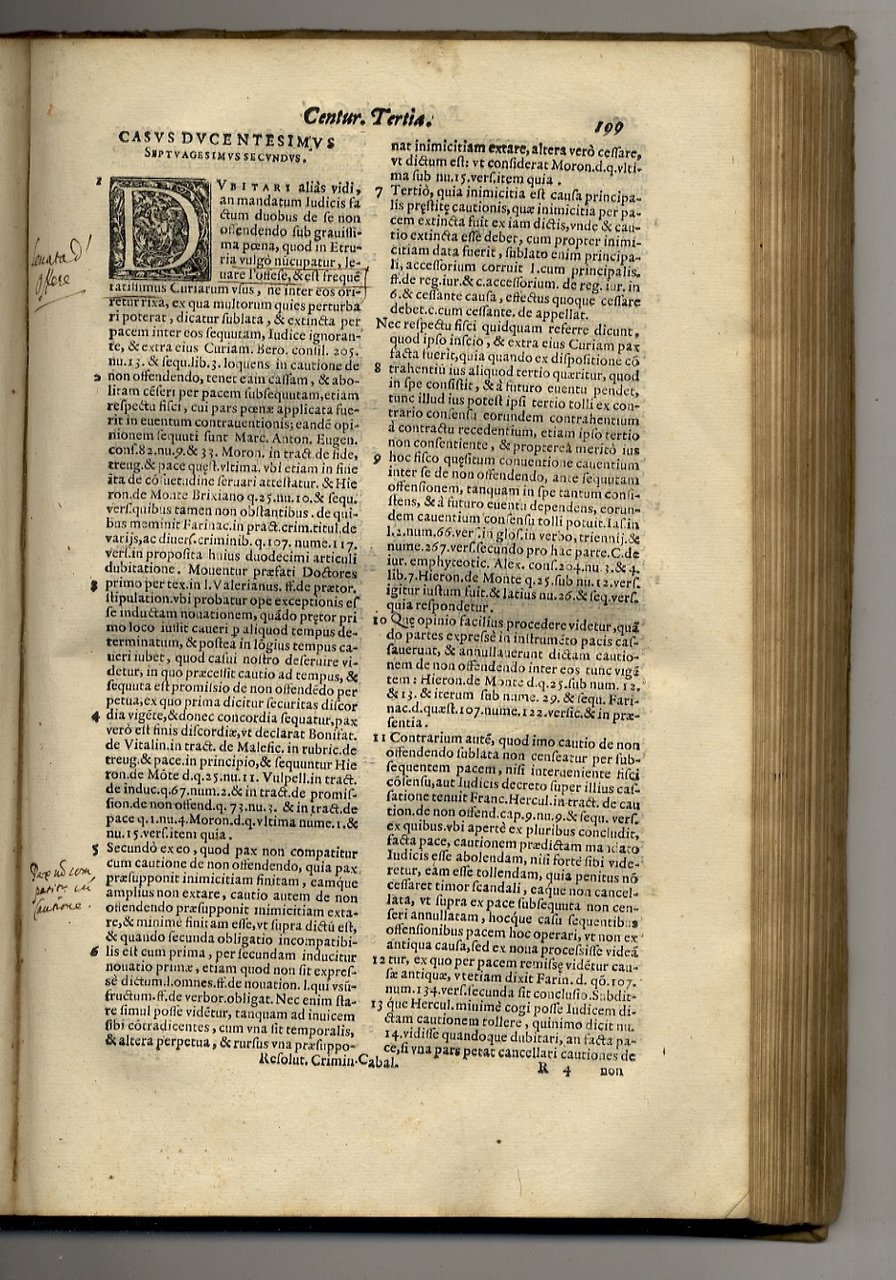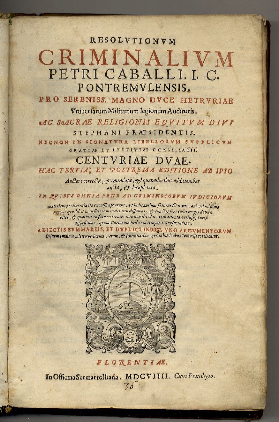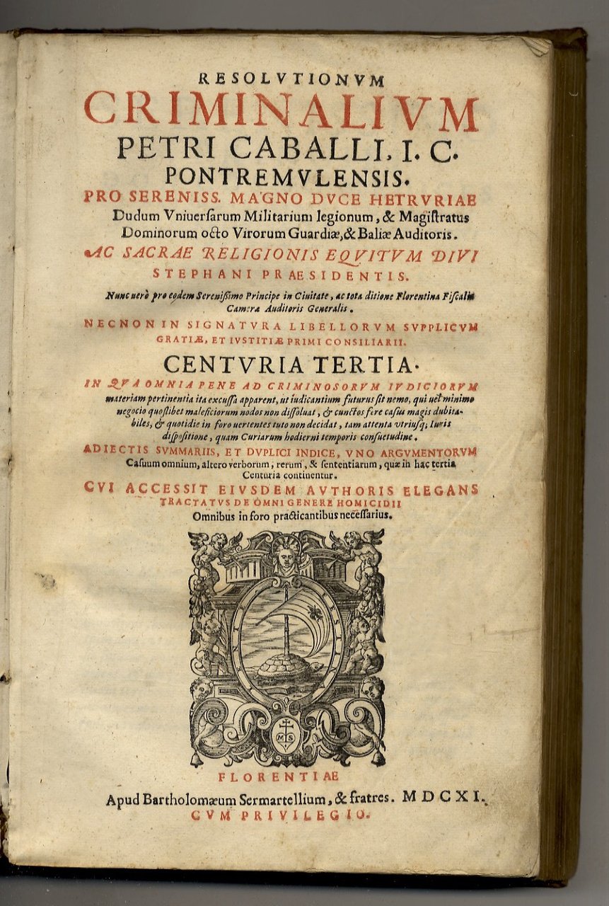 Florentiae, In Officina Sermartelliana / apud Bartholomaeum Sermartellium, 1609 / 1611, parti 3 rilegate in 2 tomi, in-folio, legatura coeva in pergamena (rigida per il primo tomo, floscia per il secondo), titolo calligrafato in antico sui dorsi e sui tagli inferiori, pp. [24], 450, [70] - [26], 366, [90] - [16], 59 ma 63 per sbaglio numerazione delle pagine, [17]. Ciascun volume con proprio frontespizio stampato in rosso e nero. Con belle marche tipografiche incise in xilografia (tartaruga che tiene sul guscio una vela con giglio fiorentino in cornice figurata e con motto "Festina lente", elementi che rimandano all'iconografia di Cosimo I de' Medici). Numerosi capilettera, testate e finalini in xilografia. Il testo è steso su due colonne. Terza edizione dell'opera principale del giurista pontremolese P. Caballo, attivo alla corte fiorentina dei Medici, che analizza trecento casi e fattispecie di diritto criminale di ogni sorta (compresi stregoneria, malefici, sodomia e pederastia più altre situazioni al giorno d'oggi stravaganti), a cui è aggiunto lo specifico "Tractatus de omni genere homicidii". In aggiunta, alleghiamo l'opuscoletto di Pietro Raimondo "Commandamento contra.", privo di brossura e con due belle incisioni in xilografia (Leone di San Marco e allegoria della Giustizia), in cui si chiede che l'opera venga ritirata in quanto si fa menzione di casi specifici e riconoscibili non veri. Ex-libris ai frontespizi; difetti, mancanze e tracce di tarlo alla pergamena dei dorsi.