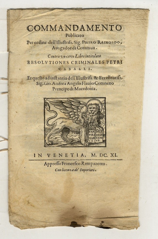 Resolutionum criminalium Petri Caballi, I.C. Pontremulensis. Pro sereniss. Magno Duce Hetruriae [.]. Centuriae duae hac tertia et postrema editione ab ipso auctore correcta [.] adiectis summariis, et duplici indice [.]. [Unito]: Resolutionum criminalium [.]. Centuria tertia [.]. [Unito]: Tractatus de omni genere homicidii [.]. [Uniamo anche]: RAIMONDO Pietro. Commandamento contra un certo libro intitolato Resolutiones Criminales Petri Caballi. (In Venetia, 1611, appresso Francesco Rampazetto, in-4, pp. 14, [2]).