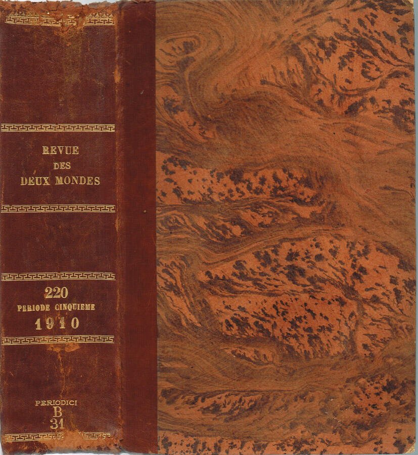 Volume LIX completo, anno 1910, LXXX.e Année - Cinquième Période del periodico Revue des Deux Mondes, fondatore: Francois Buloz. Volume intonso della seconda decade del '900 in stato discreto, rilegato con coperta, non coeva, in mezzapelle con angoli, piatti marmorizzati, sul dorso, diviso in cinque caselle, magnifici fregi e caratteri incisi in oro, alcuni segni del tempo, tracce di fioritura sparsa, tagli un po' bruniti con barbe, quello di testa di colore bordeaux, cerniera appena allentata, pagine discretamente conservate, alcune e margini lievemente ambrati. Il rilegatore ha mantenuto all'interno del volume i piatti originali del I.o fascicolo, in carta, quello anteriore con timbro ex biblioteca. Presenta timbro ex biblioteca su occhiello, segnatura. Numero Pagine 960